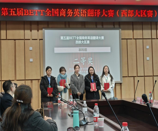 第五届BETT全国商务英语翻译大赛口译大区赛本科组“二等奖”获得者万洋洋同学(右一)