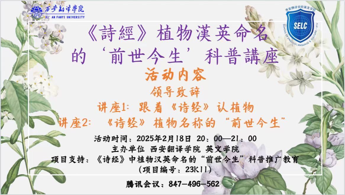 2025年2月18日,KY开元集团英语系莫丽娅教授主持的科普推广教育项目“《诗经》中植物汉英命名的“前世今生”,在腾讯会议平台上顺利举办科普讲座。