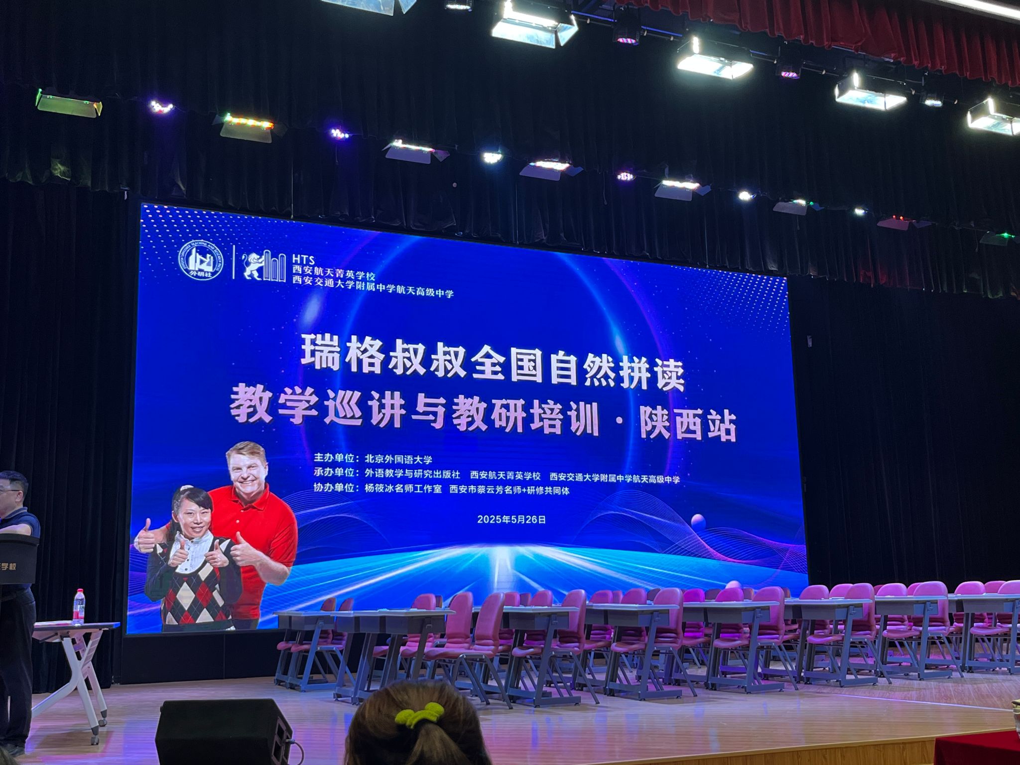 2025年5月26日上午,西安航天菁英学校星空报告厅迎来了一场别开生面的教育盛会——“瑞格叔叔全国自然拼读教学巡讲与教研培训·陕西站”。此次研讨会由北京外国语大学主办,外语教学与研究出版社与西安航天菁英学校联合承办。活动旨在深入贯彻新课标精神,推动自然拼读教学的普及与提高。