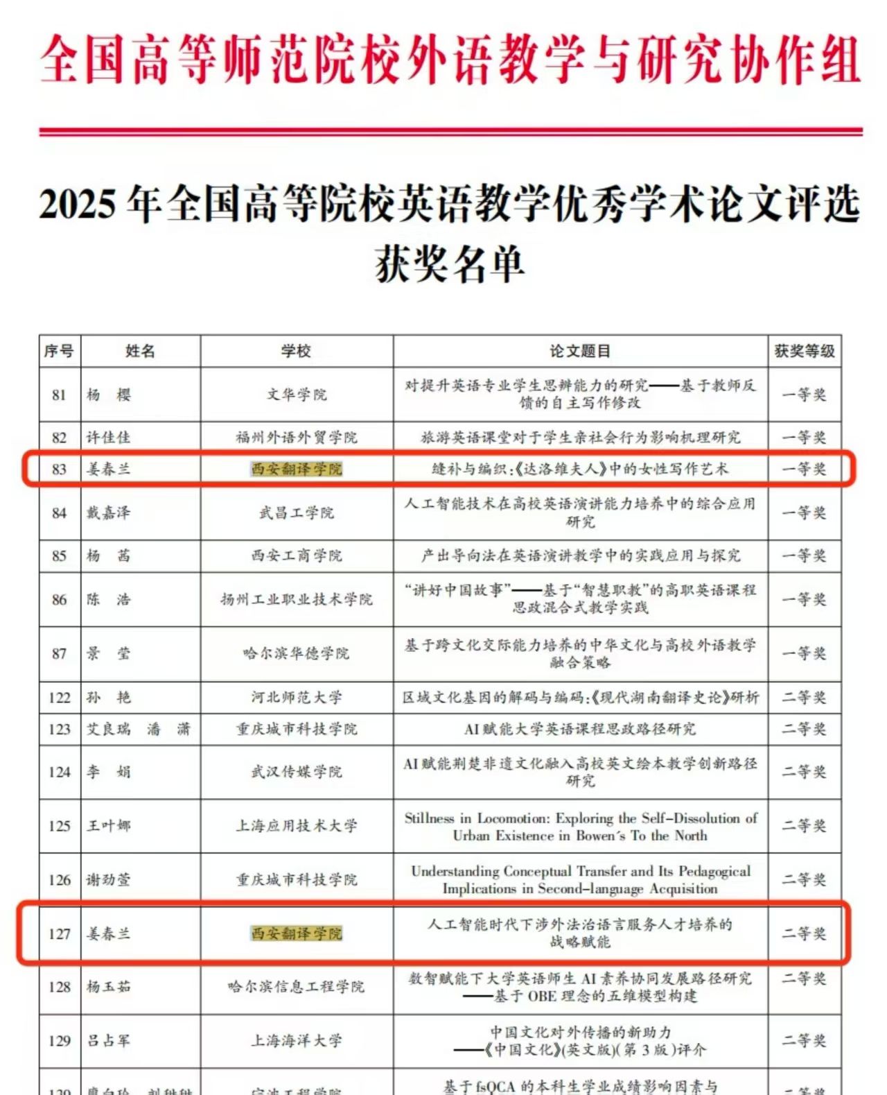 此次佳绩不仅是对我院教师个人教学水平的充分肯定,更体现了我院在英语学科教学创新、师资队伍建设及综合育人体系建设方面的显著成效。未来,学院将继续秉持“以赛促教、以研促建”的理念,深化教育教学改革,强化教师专业发展,持续提升人才培养质量,为新时代高素质外语人才的培养贡献更大力量。