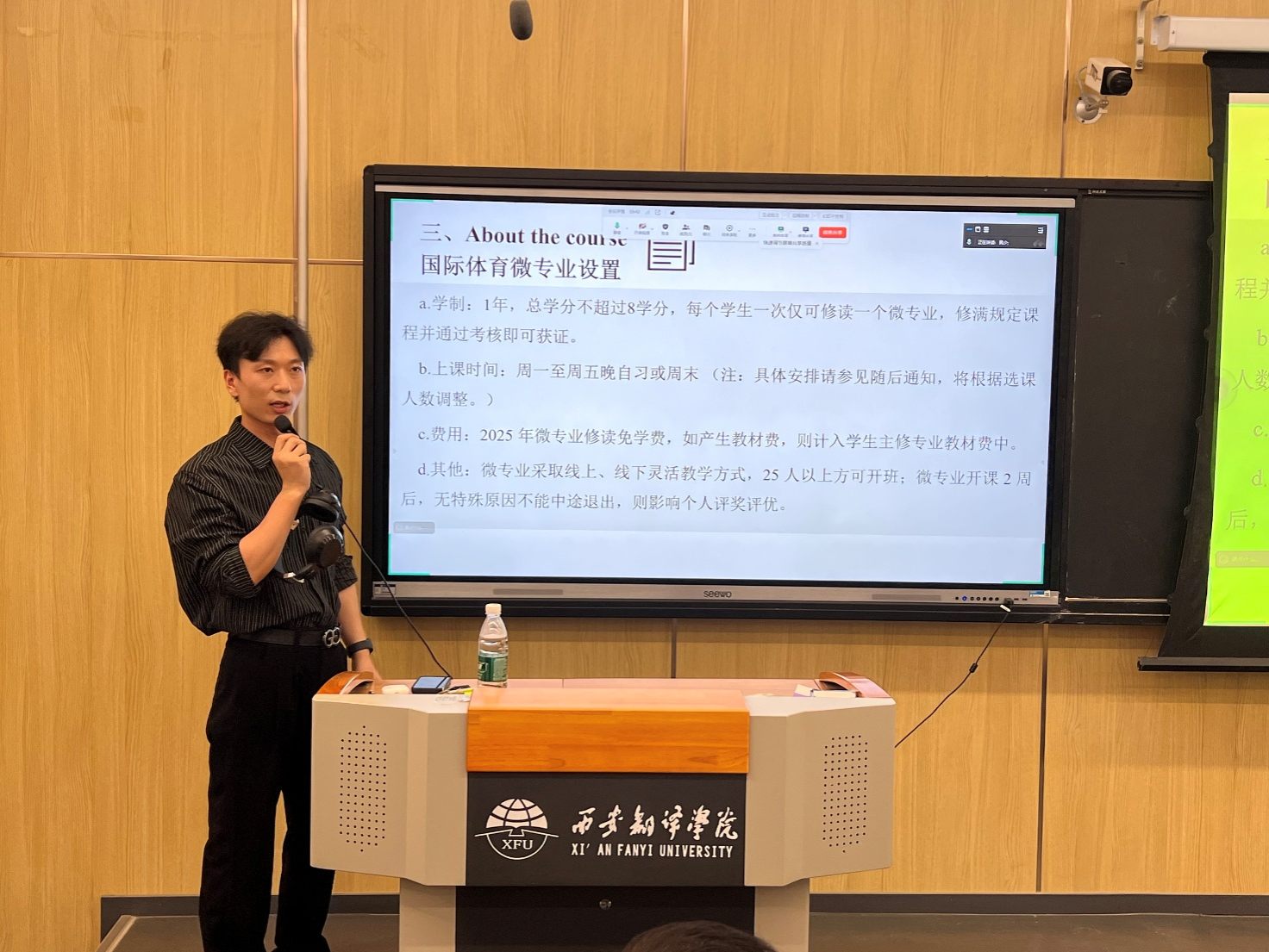 在答疑互动环节,同学们围绕课程修读要求、时间冲突协调、就业方向等问题积极提问,主讲人逐一细致解答,并分享了往届修读学生在体育赛事翻译、国际体育机构实习等方面的实践案例。现场交流氛围热烈,不少同学表示对国际体育微专业产生了浓厚兴趣,认为其为自身职业发展提供了新的方向。
