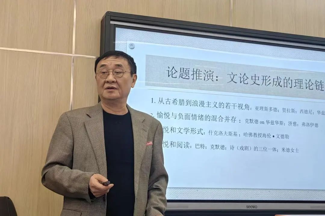 在李燕教授的提议之下,在场师生共同朗读了童明课件上的一段话:美学研究和文学阅读带来什么样的愉悦?接受挑战的愉悦,扩展认知范畴和能力的愉悦,掌握别人已知的知识的愉悦,进入陌生世界的愉悦,邂逅他者意识产生共情的愉悦,进入更广阔对话的愉悦。