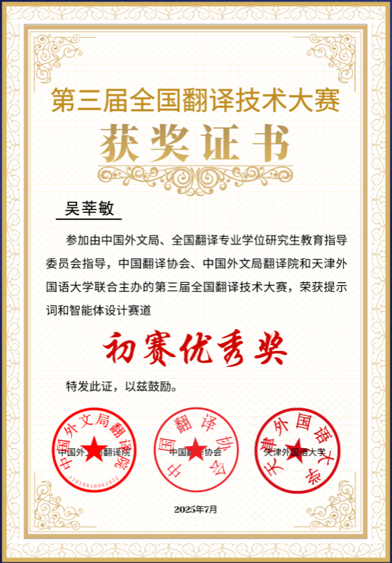 同时,学院结合专业特色,组织学生参加了译后编辑能力赛道与提示词与智能体设计赛道。两个赛道着重考察学生的翻译技术综合知识、人工智能辅助翻译应用能力、译后编辑能力以及基于大模型平台的智能体设计和应用能力。通过激烈角逐,翻译系卢政衡同学和英语系吴莘敏同学荣获该赛道初赛三等奖,陈丽琪、范晴雯等20位同学荣获优秀奖,共计22位同学成功晋级决赛。吴莘敏同学荣获提示词和智能体设计赛道优秀奖,并顺利晋级决赛
