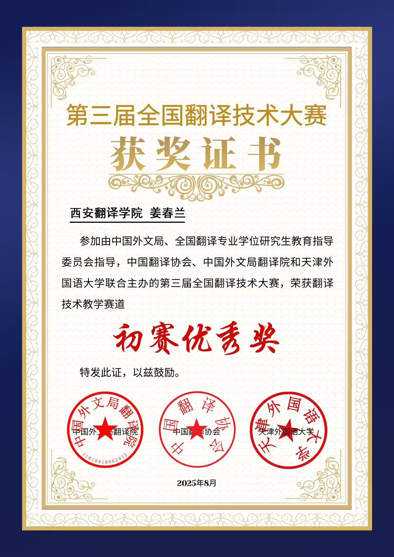 在本次大赛中,英语学院师生积极参与多个赛道并斩获佳绩。学院组织教师参加了翻译技术教学赛道,该赛道重点考察参赛者在翻译技术课程设计、课堂教学实践及教育技术应用等方面的综合能力。我院翻译系杨振刚老师和英语系姜春兰老师分别荣获初赛三等奖和优秀奖,成功晋级决赛。