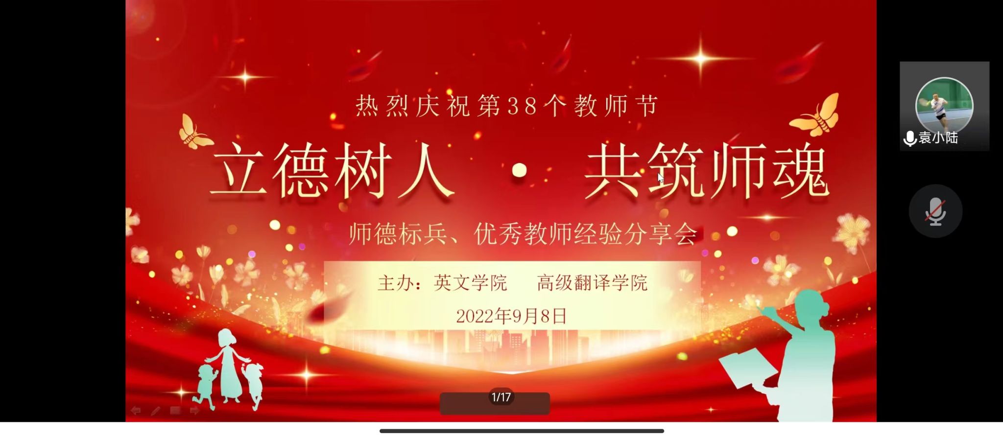 随后,袁小陆院长做总结发言,首先向全体教职工表示真挚的节日慰问。他对做分享的几位老师给予了充分的肯定,并总结概括了两个学院精彩纷呈、亮点频出的教育教学工作。会上,他从一名老教师的角度,谈了自己的感想,教师从事的是塑造人的灵魂的伟大事业,一支粉笔两袖清风,三尺讲台映衬着四季晴雨。他鼓励大家要做一个“思想有深度,教学有智慧”的人民教师。他表示在今后的工作中我们要依托校理事会、学校给予的平台,将翻译专业和英语专业特色紧密融合,打破学科壁垒,共享优势资源,筹备组建课程思政教研室,加强学科特色和精品课程建设,着力凝炼国家级一流专业建设特色,进一步提升教师教学和科研水平,最后他号召全体老师向师德标兵、优秀教师们学习。“时代呼唤英雄,两个国家级一流专业建设需要标兵”!全体老师一定要齐心合力、为我们的学科建设和发展贡献力量!为两个国家级一流专业建设,献计献策,共筑辉煌!