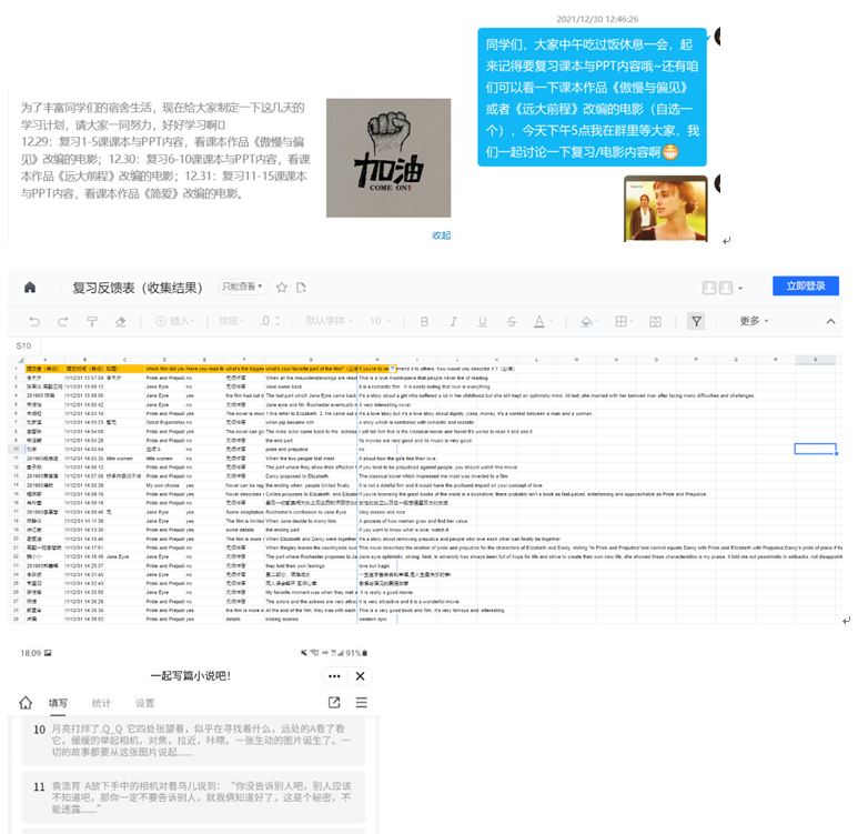 杨修平老师以《英美文学选读》课程内容为基础,以缓解学生学习压力与缓解封锁焦虑为目标开展了与复习课程知识内容相关的活动。 安排学生根据自己的兴趣,观看根据课本作品改编的相关电影,在QQ群内开展讨论;同时注重收集学生书面反馈,了解学生学习情况。