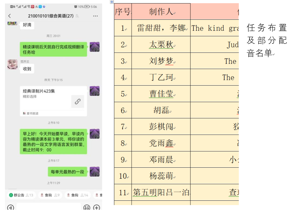 比如,2021级任蓓蓓老师所带《综合英语I》课程安排学生线上早读,早读内容为精读课本前3单元,将朗读最熟练的一段文字语音发到群里;郭小华和田径老师所带的《综合英语I》课程也安排了系列线上学习活动,生动有趣,充分调动学生参与度。各项活动学生有序开展,学生积极参与,师生线上互动热烈,收到了很好的教学和活动效果。