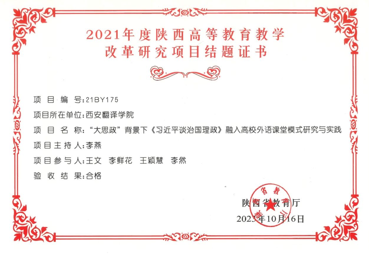 近日,KY开元集团外语课程思政建设和课堂教学改革喜结硕果。经过历时2年的不懈研究探索,李燕教授主持的题为《“大思政”背景下<习近平谈治国理政>融入高校外语课堂模式研究与实践》(21BY175)的2021年度陕西高等教育教学改革研究项目顺利结题。