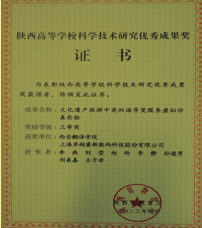4月17日,陕西省教育厅发布了《陕西省教育厅关于表彰2023年度陕西高等学校科学技术研究优秀成果奖的通报》(陕教函〔2023〕366号)文件。我院教师李燕、刘莹、赵玲等老师的成果《文化遗产旅游中英双语导览服务虚拟仿真实验》荣获三等奖,标志着我院科学技术研究成果质量的显著提升。