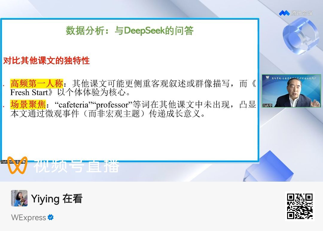 冯庆华教授在直播中讲到了DeepSeek应用于文本解读、数据分析、试卷制作、评分复核和修辞翻译,在数据分析场景中,冯教授现场演示了用AntConc等语料库工具制作一个课文关键词统计表,连同课文本身,一起上传给DeepSeek平台,根据上传的文档Unit one: Fresh Start (Fresh Start为外研社《综合教程》第三册的第一课),仔细解读Excel数据表“Fresh Start”关键词,参照文本为同一教材里的另外7篇课文,请写一份详细的数据分析报告。冯教授利用DeepSeek,用时37秒快速生成了1040个字符的深度思考报告,在高频词汇分析中得出:(1)第一人称代词“my"(第1名)与”I“(第2名);(2)场景关键词”cafeteria“(第3名)与”college“(第4名);(3)次要关键词”tray“(第5名)、”campus“(第6名)和”professor“(第7名)。最后得出结论:Fresh Start通过高频使用第一人称代词及特定场景词汇,构建了高度个人化的叙事风格,聚焦大学新生的尴尬、反思与成长。关键词的统计显著性不仅体现语言特征,更服务于主题表达——即在错误与幽默中完成自我接纳。与其他课文相比,本文更注重通过微观事件与情感细节传递普世性的”新生体验“,语言风格生动且具感染力。DeepSeek以其强大的数据分析能力,为外语教学提供更高效的辅助研究。