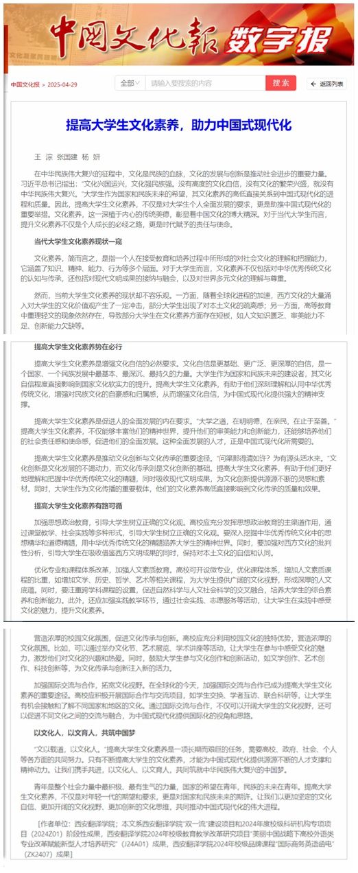 《中国文化报》作为中宣部直属的国家级文化理论阵地,其理论版聚焦阐释党的创新理论、传播中华优秀传统文化、推动社会主义文化繁荣发展。该文章从“文化素养的当代价值重构”“高校文化育人机制创新”“文明互鉴视域下的青年使命”三个维度展开论述,既回应了“培养什么人、怎样培养人、为谁培养人”的根本问题,也为高校落实立德树人根本任务提供了方法论启示。文中特别强调:“全球化语境下,大学生需以中华文化主体性为根基,在跨文化传播中实现传统文化的创造性转化与创新性发展,这正是中国式现代化‘文明型’特质的必然要求。”