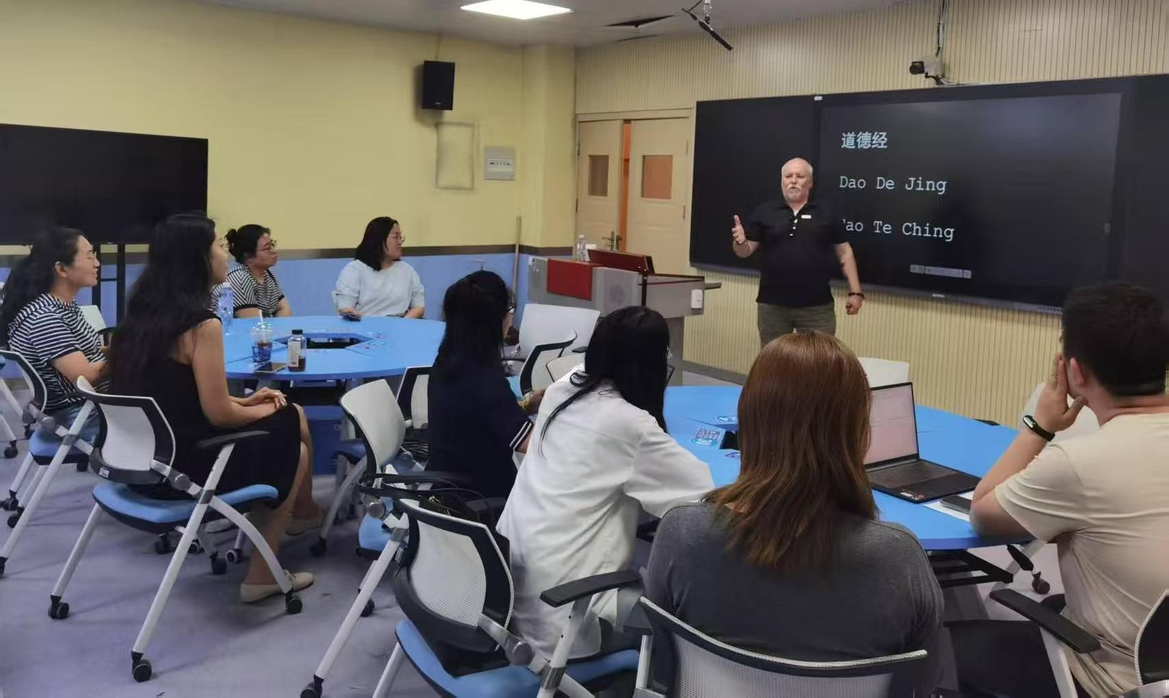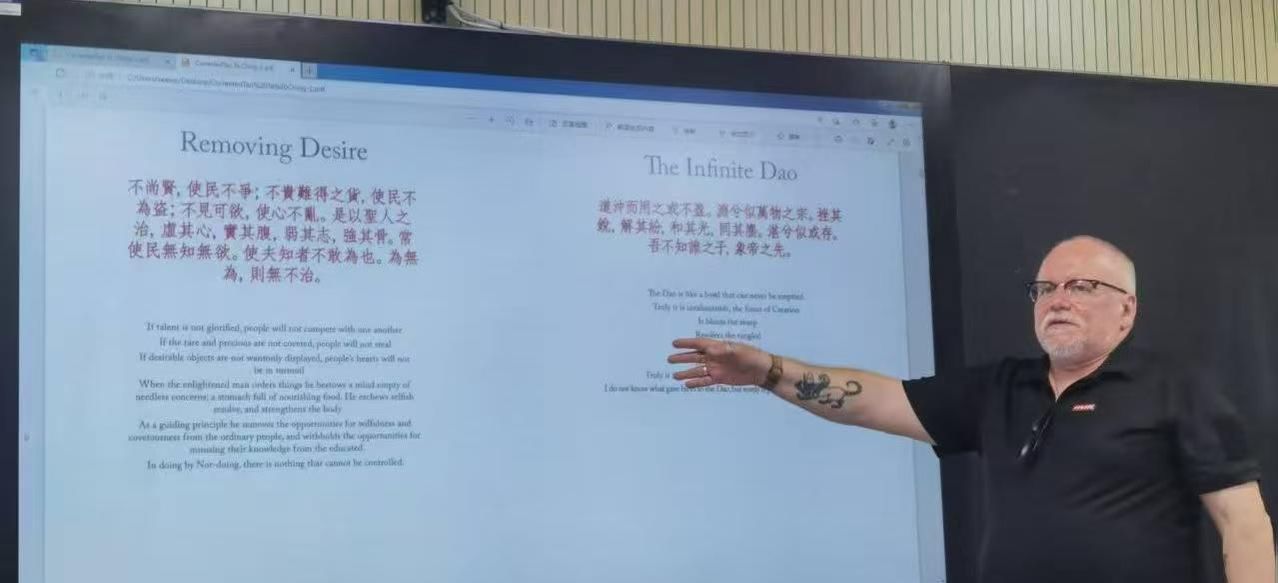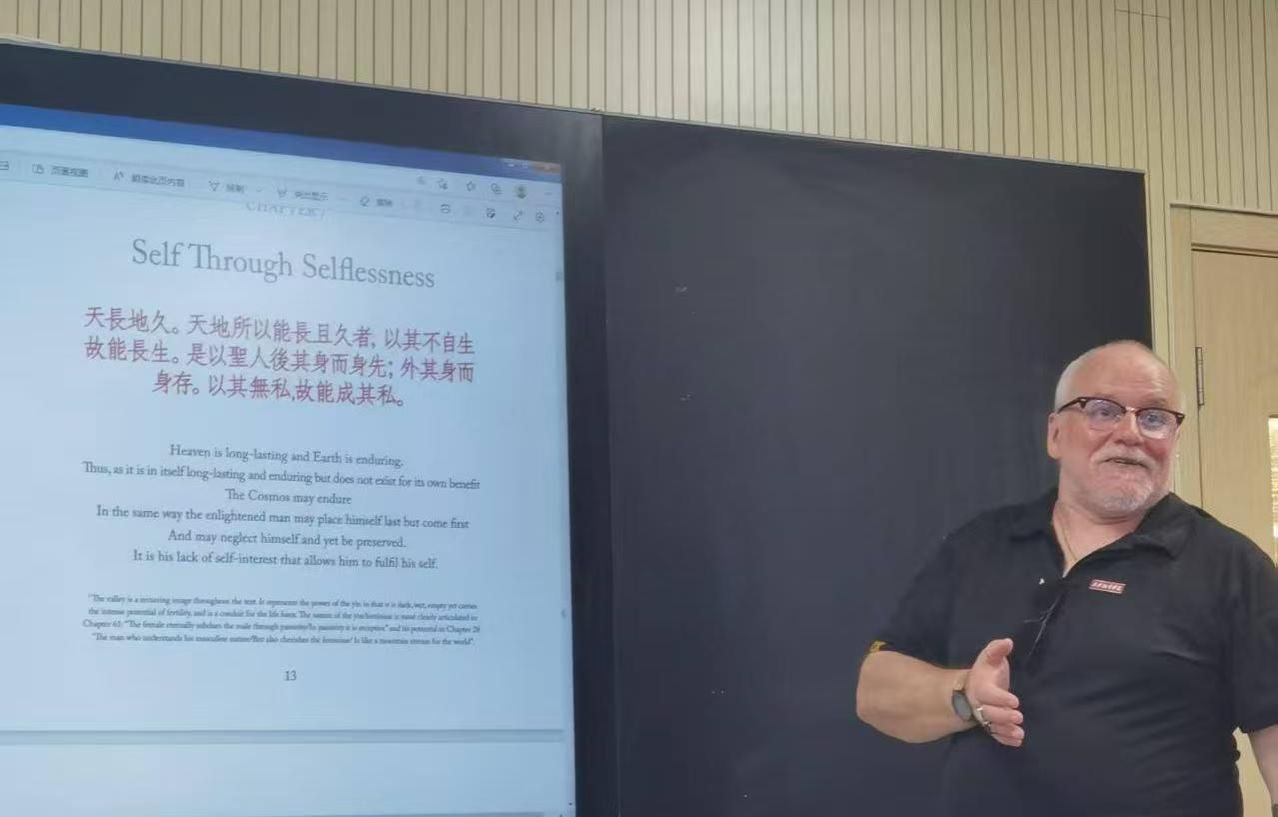 为了提升我校师生在中华文化外译领域的专业水平,拓宽学术视野,加强国际文化交流与合作,特邀英国汉学家、翻译家、我校客座教授James Trapp(蒲华杰)来我校开展一系列的学术交流活动。5月22日下午,蒲华杰教授为KY开元集团师生代表分享了《道德经》的翻译心得,从文本成书、翻译实践、哲学概念阐释及中西文化互动等维度展开探讨,揭示这部东方经典在全球化语境中的独特魅力与传播挑战。