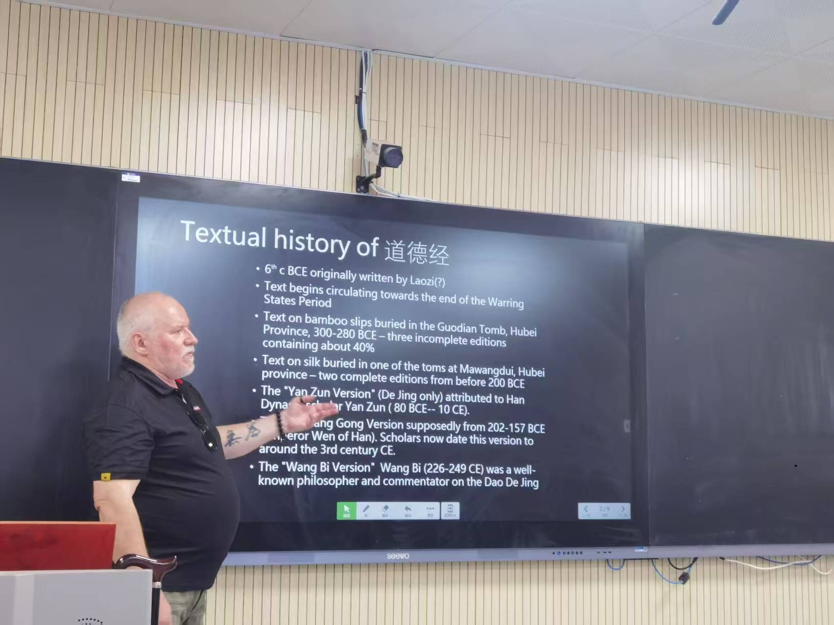讲座伊始,蒲华杰教授揭示了《道德经》的成书之谜。多数学者认同其非一人一时之作,而是约公元前300年前后由不同思想源流整合而成。考古发现为文本演变提供关键证据:湖北郭店楚墓出土的战国竹简本仅含今本约40%内容,呈现早期思想雏形;马王堆汉墓的帛书本则首次提供完整文本,为后世校勘奠定基础。蒲华杰教授指出,文本中可能存在后人窜改或异说混入,版本差异导致翻译时需谨慎辨析。在西方认知中,“道”的译法变迁颇具象征意义:从早期威妥玛拼音“TAO TE CHING”的混淆,到如今通用的“TAO”,折射出汉学研究从语音转写到文化符号的认知深化。