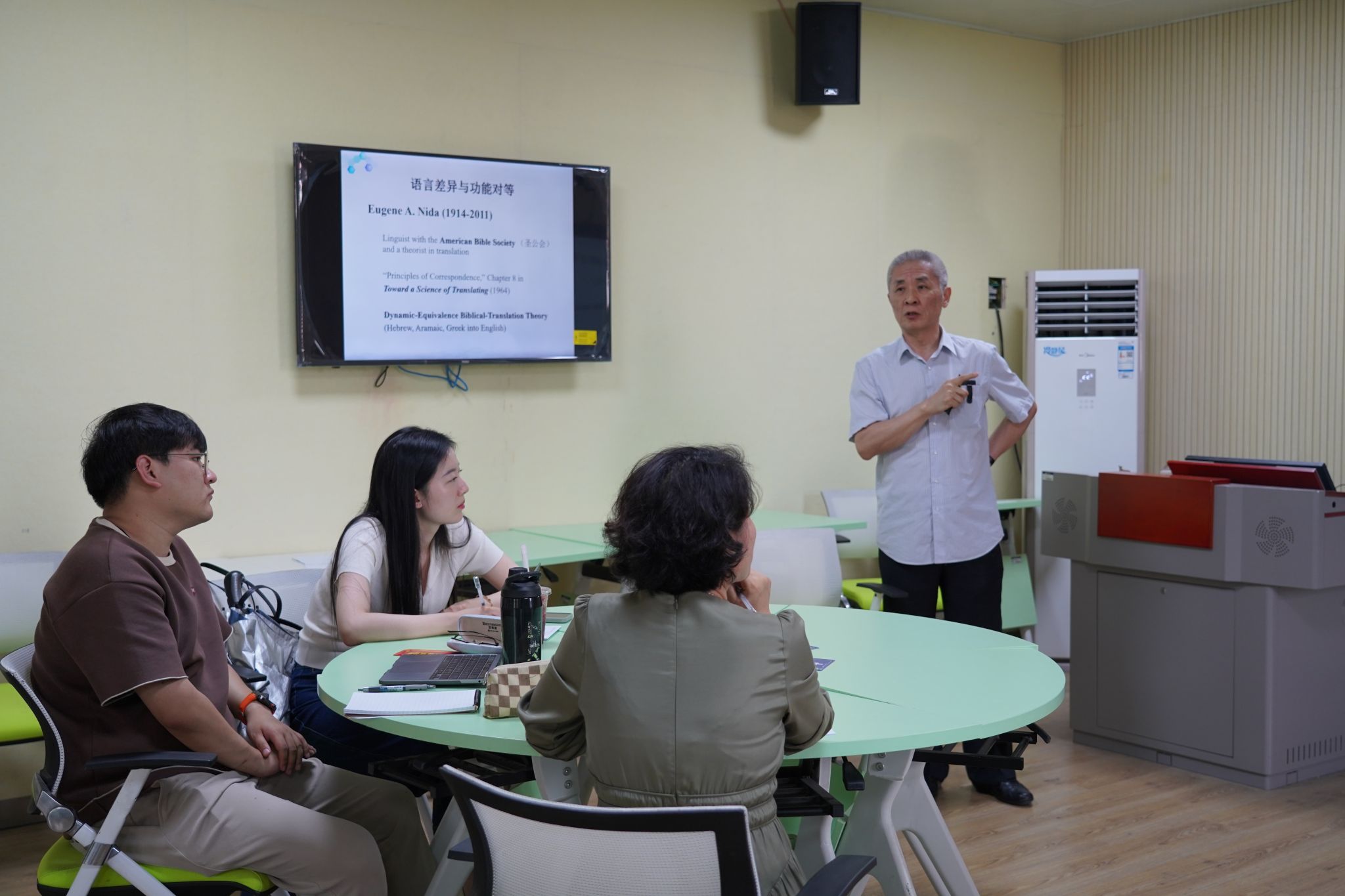 首先,王教授为我们解读了何为功能对等,随后,王教授介绍了两种可以采用的翻译方法,即:1.形式对等:强调双语字句和语序对应,这使得译文有时难免生硬含糊;2.动态对等:即在源语信息准确的前提下,自由调动译入语序。王教授指出,奈达对等概念的调动过程采用了先“动态对等”,以最自然的译入语语言,再现源语信息,再改用“功能对等”,即先谈内容,内容第一,再谈形式,形式第二的原则。奈达认为,对等的目的是准确传递信息。奈达理论的要点,在于内容对等和语言对等,前者为主,后者为辅,这是因为分属于不同语系的语言难以实现语言对等,如汉语古文与英语古文无法实现语言对等。随后,王教授还进一步为老师同学们讲解了汉语文字、语言的演变与特征,英语语言文字的演变历史,以及中英语言之间的差异。