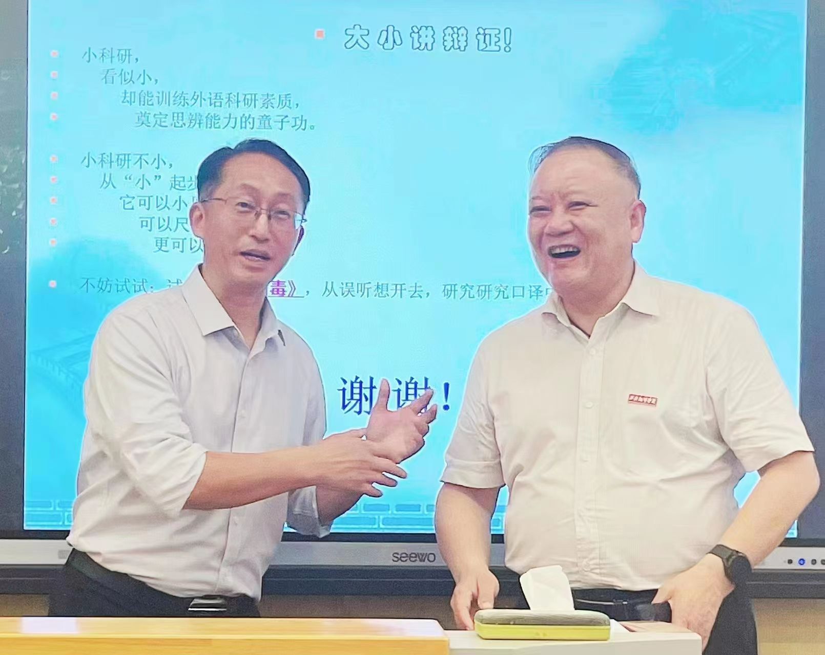 黄教授还结合“中国‘外语’源流考”、“‘外语’及相关词语的演变考”等史实,以外语小科研为对象,以小说、例话或例说外语小学问研究的观察充分、描写充分、分析充分、解决充分与解释充分五个方面为切入点,通过各个研究方向的成功课题案例详述了如何选题、如何定题的过程,并向教师们讲解了小文章和大论文的显著区别。当黄教授即兴唱起鄂西民歌《六口茶》,以此为例从歌词的语境和语气延展出诸多可研究课题时,全场响起了热烈的掌声。