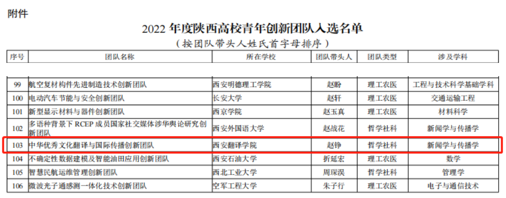 陕西省教育厅近日发布了《关于公布2022年度陕西高校青年创新团队入选名单的通知》,我校KY开元集团老师赵铮带领申报的“中华优秀文化翻译与国际传播创新团队”成功入选。