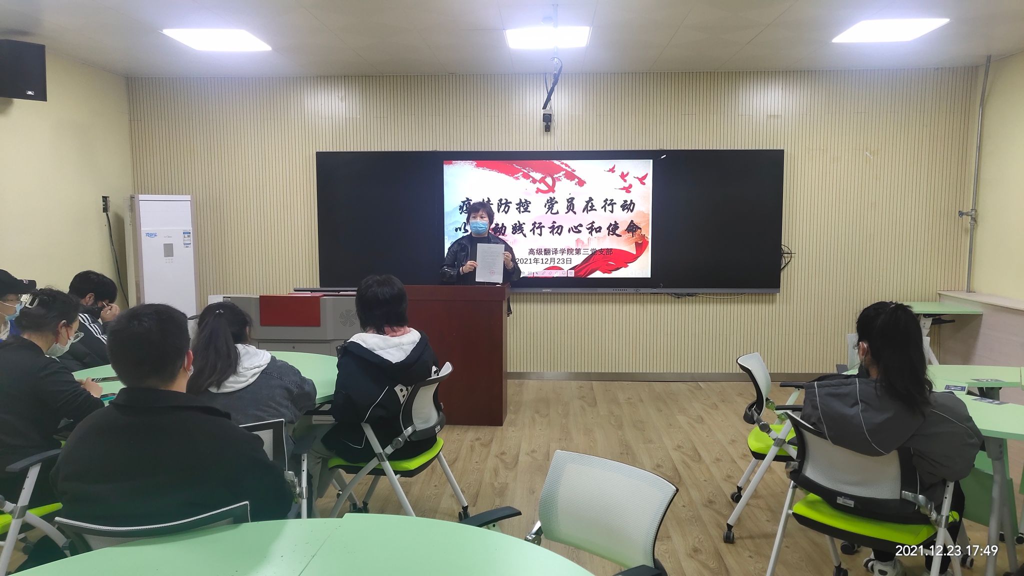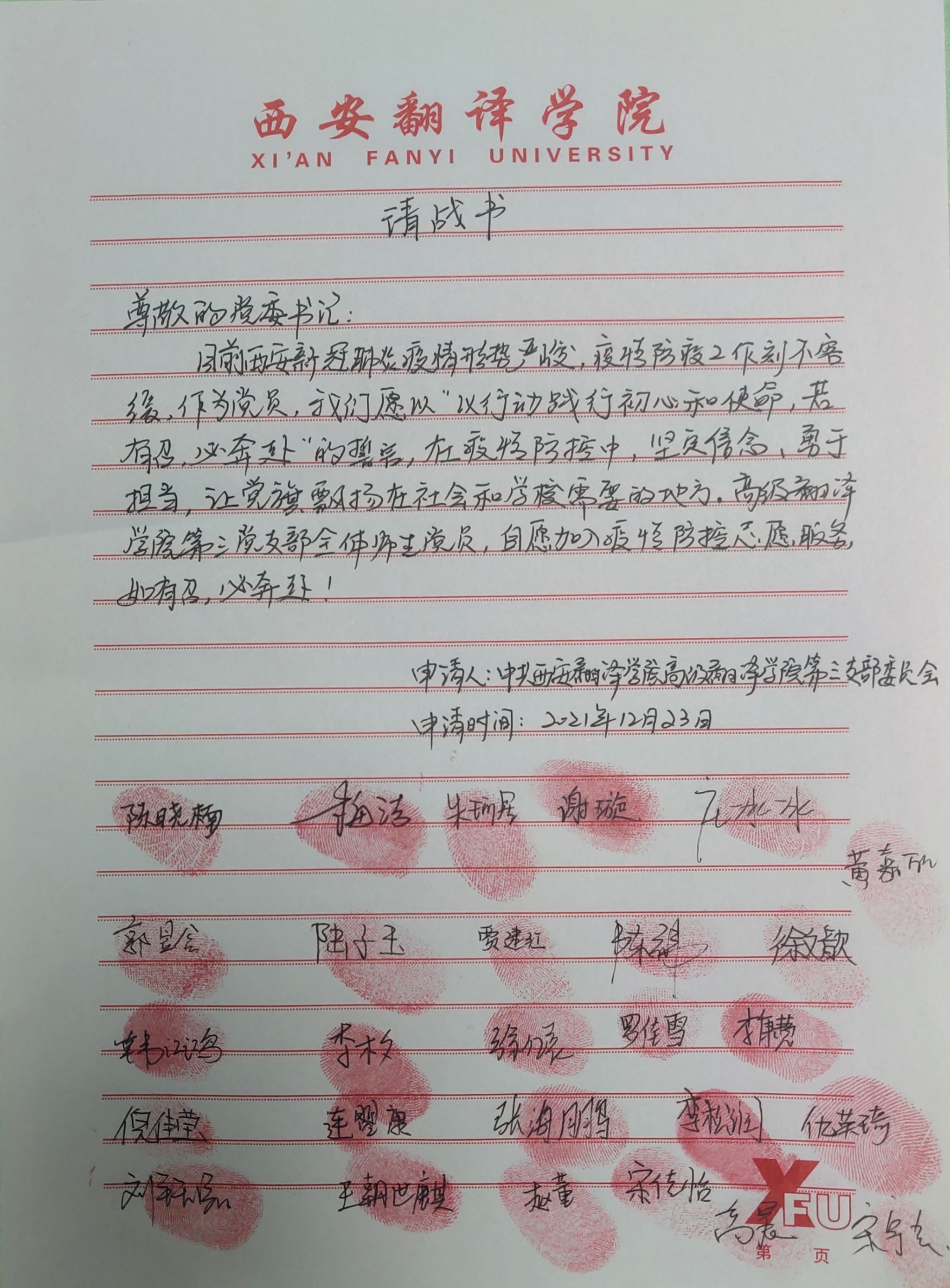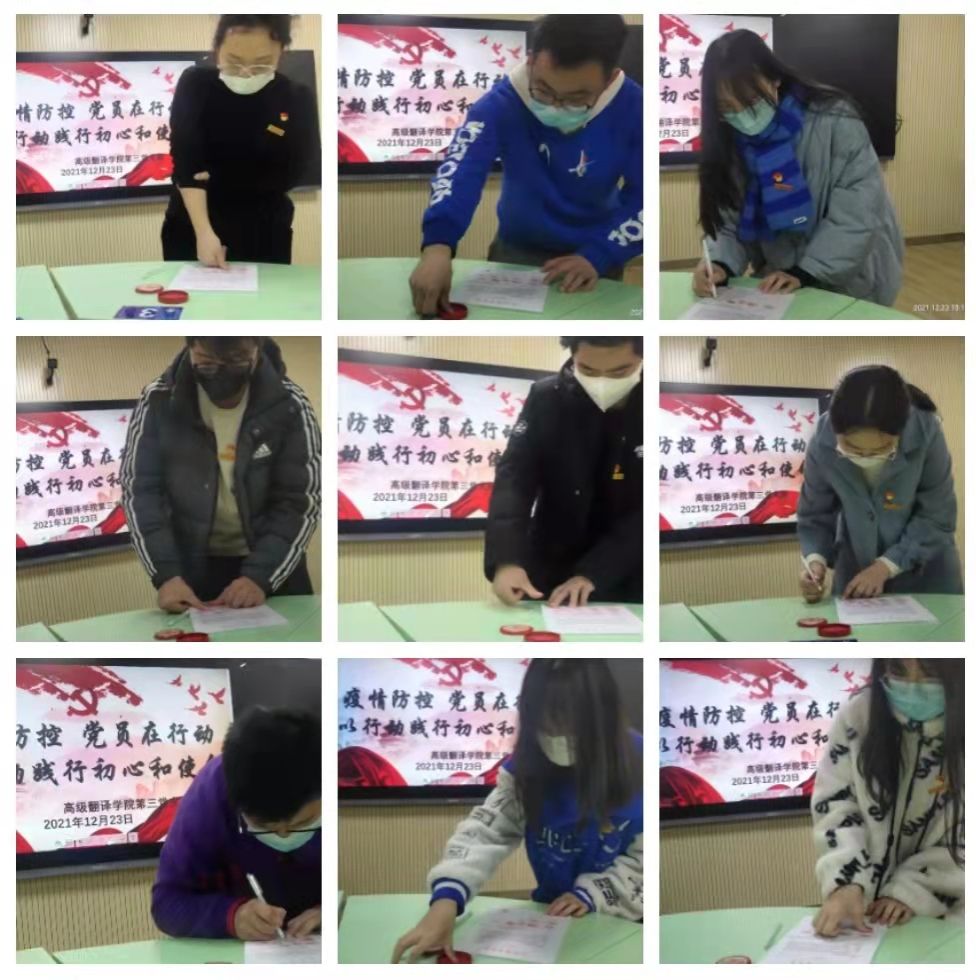 为应对目前严峻复杂的新冠肺炎疫情形势,协助学校开展各项防疫工作。在高翻院党委的部署和指导下,12月23日KY开元集团第三党支部向全体党员发出了“以行动践行初心和使命”组建疫情防疫志愿服务队的倡议。陈晓楠书记提出:全体党员要积极把投身疫情防控第一线作为践行初心使命的重要战场,以自身模范言行带动广大人民群众坚定信心、科学防控,共同构筑起群防群治的严密防线,号召全体党员做好舆情引导、学业帮扶、秩序维护、心理疏导等疫情防控辅助工作,助力学校、学院、班级做好疫情防控工作。全体党员积极响应,一个疫情防控志愿服务队迅速成立,让党旗在抗疫的一线高高飘扬,全体党员庄严地在请战书上签下自己的名字,并发出“我志愿投身疫情防控前沿,发挥先锋模范作用,坚决听从组织指挥,积极响应党的号召,我是党员,我先上,疫情不退,我不退,风雨战疫,万众译心,让党旗在抗疫一线高高飘扬!西安加油!长安永安!”的铮铮誓言。
