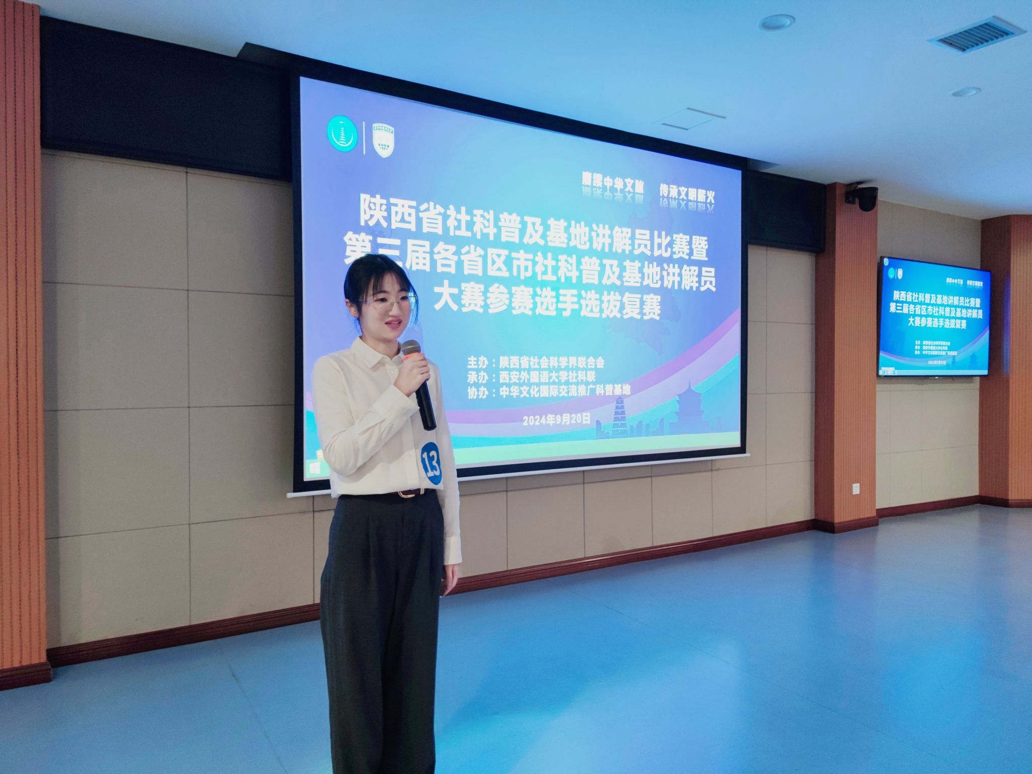 9月20日,由陕西省社科联主办、西安外国语大学承办的“陕西省社科普及基地讲解员比赛暨第三届各省区市社科普及基地讲解员大赛参赛选手选拔复赛”在西安外国语大学雁塔校区举行。文化传承与翻译体验馆科普基地成员杨雨琦老师荣获“三等奖”。