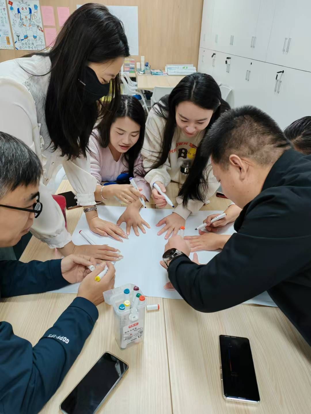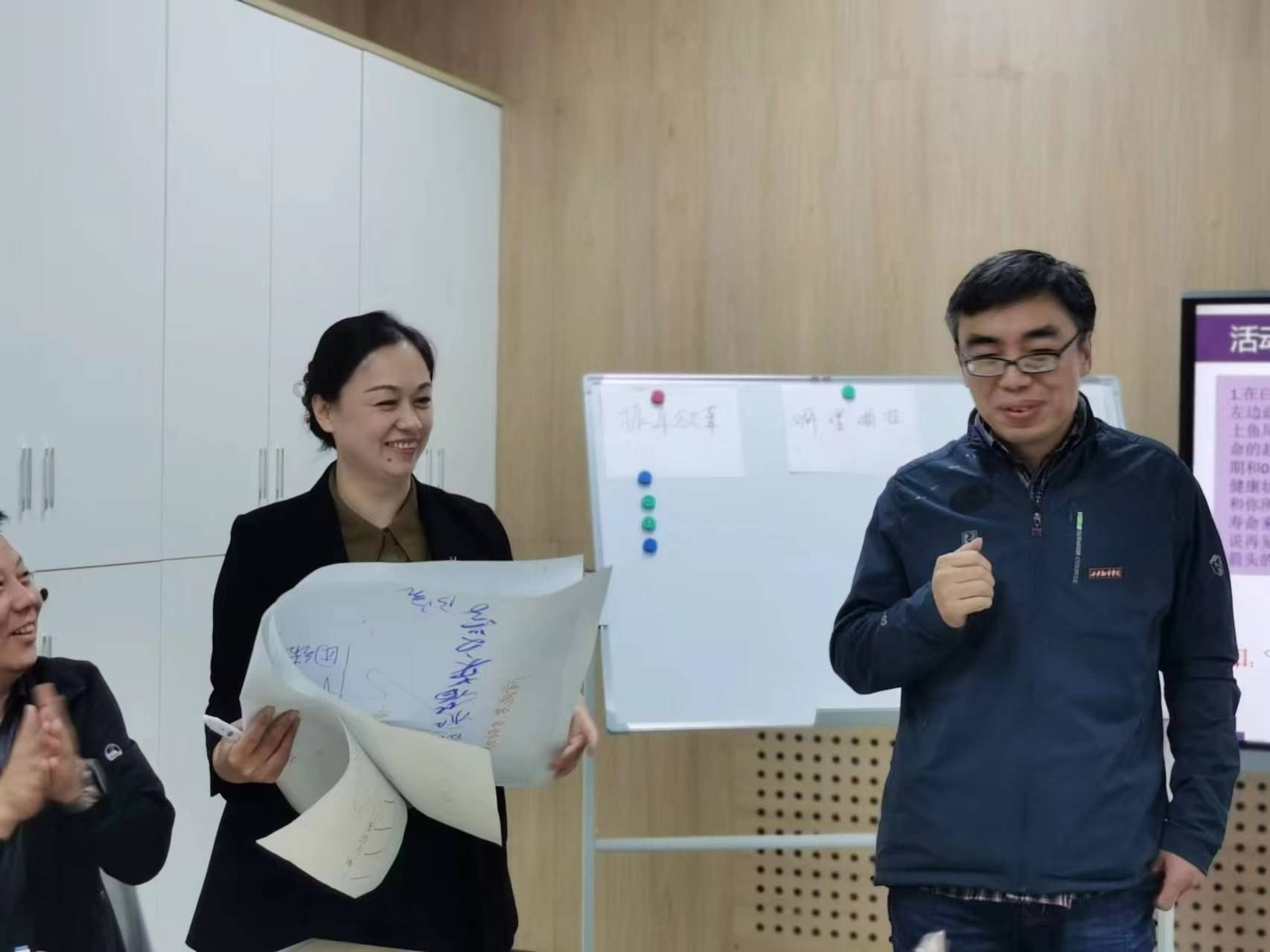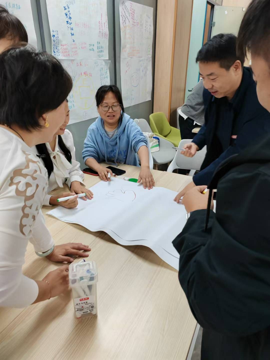 在理论学习之后,活动进入了紧张而有趣的团队游戏环节。首先进行的是“石头剪刀布”的游戏,两两分组,输的人要进入赢的人的队伍,看哪位老师能获得最终胜利。这一游戏不仅活跃了现场气氛,更让学工人员在轻松愉快的氛围中加深了彼此之间的了解和信任。随后,各个小组“用手画图案说意义”的游戏更是将团队合作和创新思维发挥到了极致。每个小组都充分发挥想象力和创造力,用手绘出了各具特色的图案,并生动诠释了图案背后的意义。这一环节不仅锻炼了学工人员的团队协作能力,更激发了大家的创新思维和表达能力。