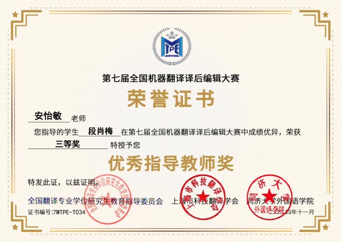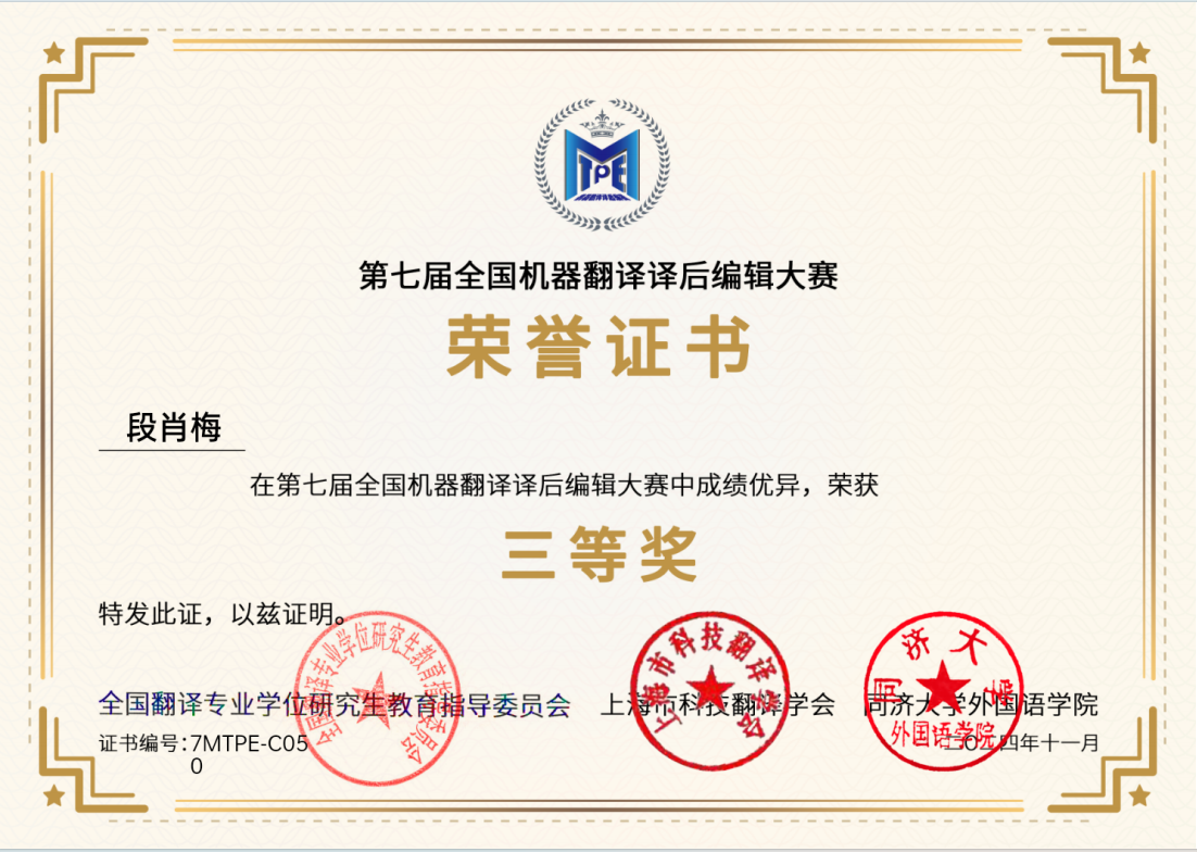 2024年11月30日,第七届机器翻译与译后大赛圆满落幕,KY开元集团KY开元集团学子段肖梅在此次大赛中表现出色,荣获决赛三等奖,实现了近三年来学院在此类赛事中的重大突破。这一荣誉不仅彰显了西译学子在机器翻译领域的专业素养和实践能力,也进一步提升了学校的知名度和影响力。