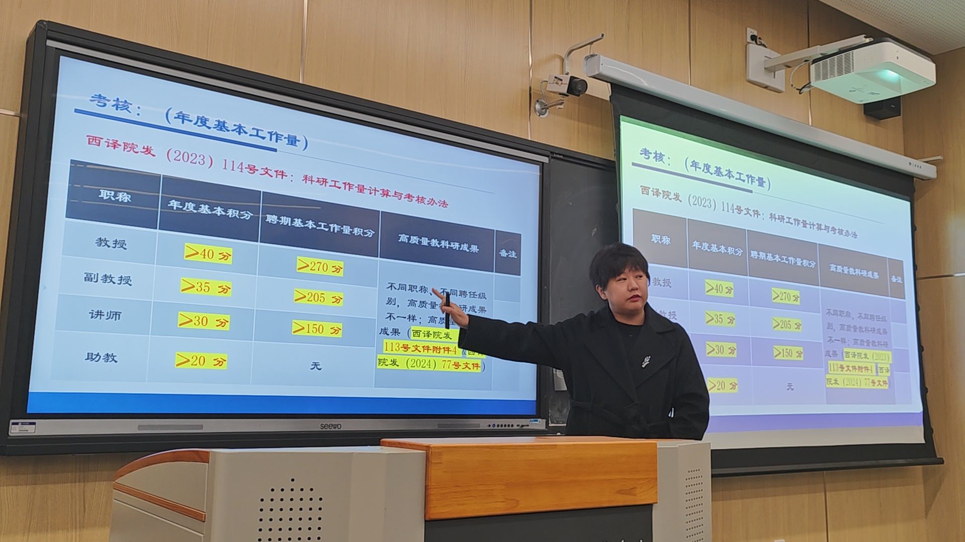 科研副院长张睿随后对 2024 年度的科研工作进行了总结。她指出,过去一年学院科研成果丰硕,承担了多项省部级科研项目,发表了一批高水平学术论文, 为进一步激发教师的科研积极性,张院长详细解读了学校最新的科研政策。她强调,新政策在项目申报、经费支持、成果奖励等方面都进行了优化调整,旨在为教师开展科研工作提供更多便利和激励。同时,她也对教师完成科研任务量提出了明确要求,鼓励教师合理规划科研任务,积极参与科研团队建设,提升整体科研水平。