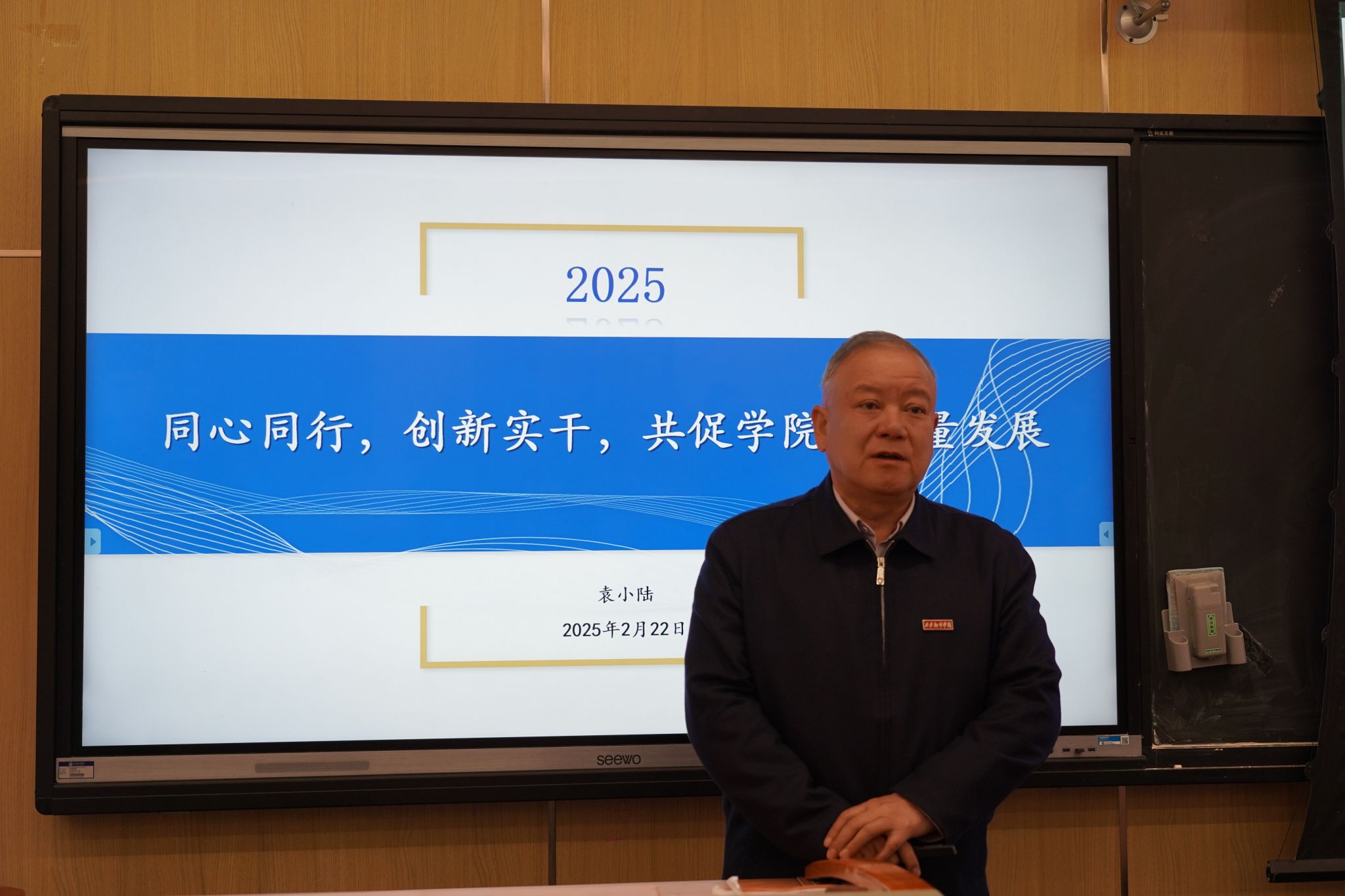 院长袁小陆作题为《同心同行,创新实干,共促学院高质量发展》的讲话,首先他转达了理事长和校领导对学院全体教职工的亲切问候以及对学院工作的关注关心。对过去一年学院的年度任务完成情况进行了全面盘点,充分肯定了学院在教学、科研、学生工作等方面取得的成绩,同时也客观分析了部分任务未完成的主客观因素。分享了自己在过去一年的个人业绩与改革创新经验,强调了创新管理和团队协作的重要性。他特别提及了寒假期间老师们取得的一系列惊喜成绩,喜报连连,充分展现了学院教职工积极奋进的精神风貌。