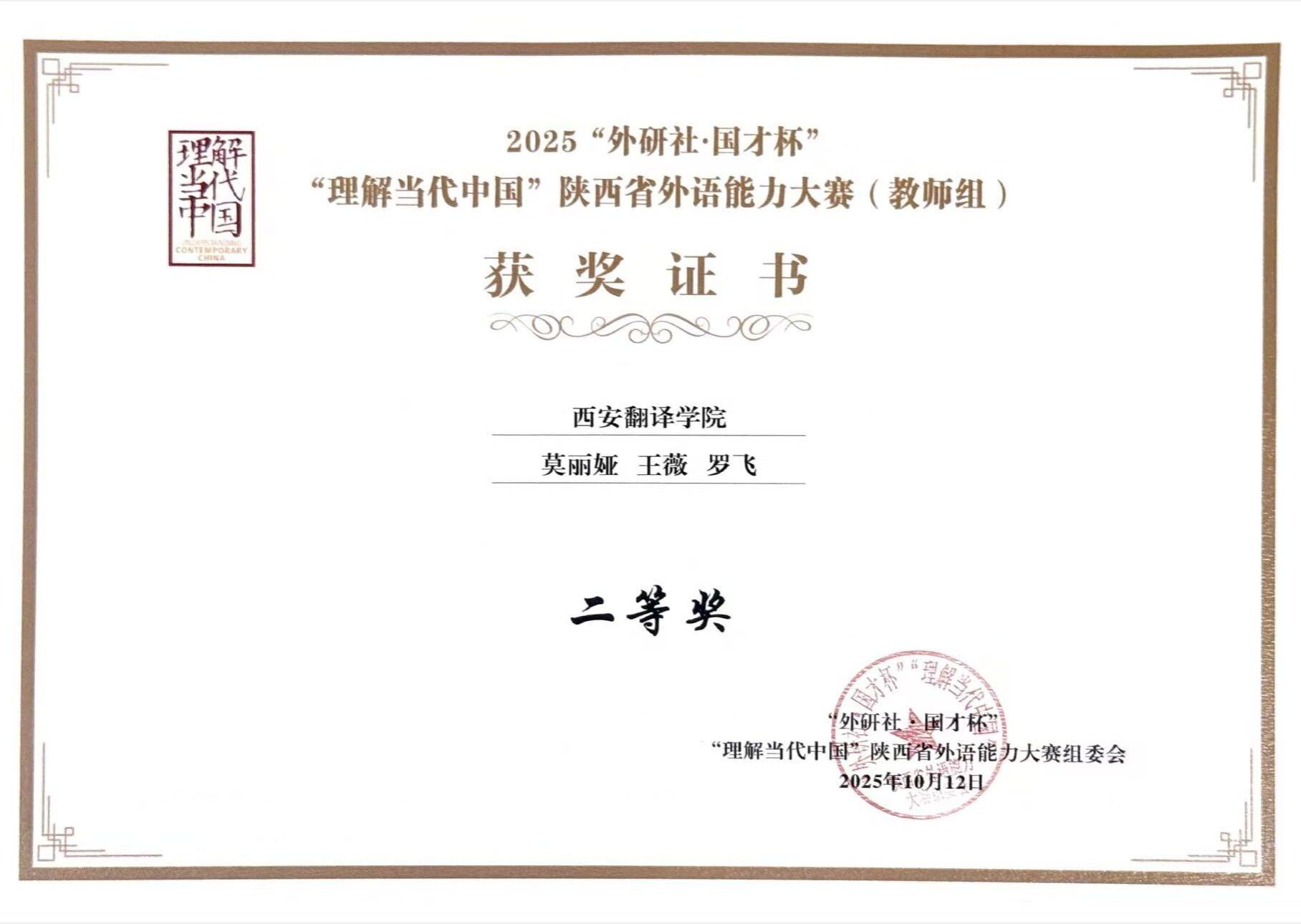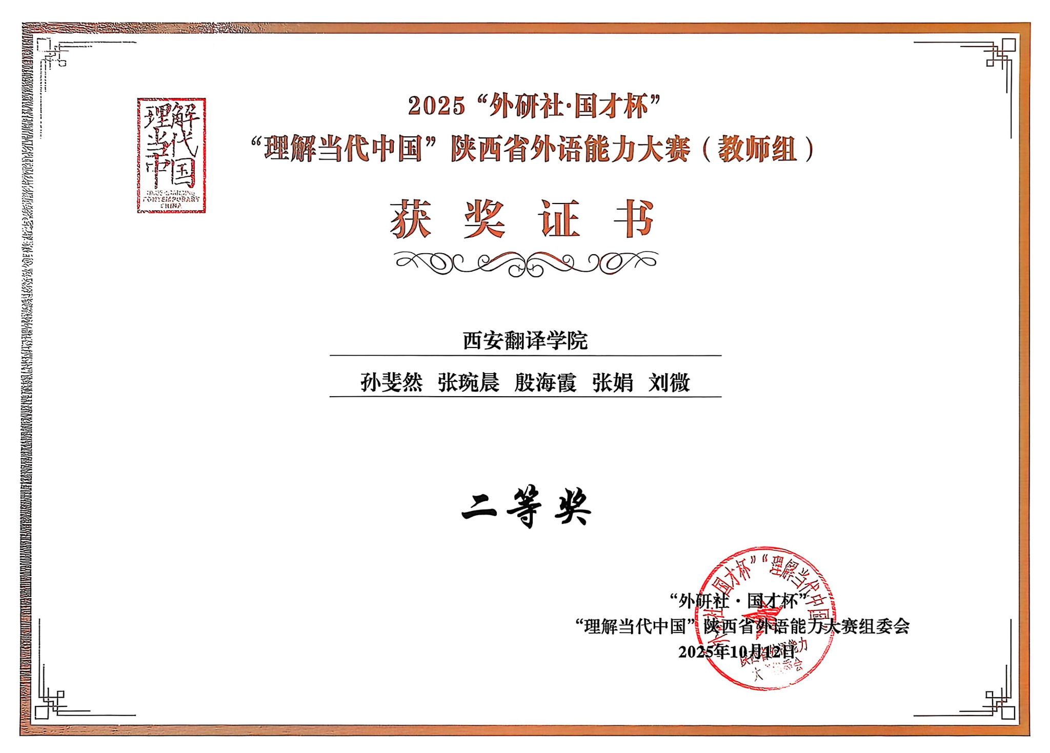 近日,2025“外研社·国才杯”“理解当代中国”陕西省外语能力大赛(教师组)决赛在西安交通大学兴庆校区圆满落幕。经过院校选拔、全省复赛的激烈角逐,我校KY开元集团教师孙斐然、张琬晨、殷海霞、张娟、刘微组建的大学英语团队和莫丽娅、王薇、罗飞组建的汉英翻译团队凭借深厚的教学素养、创新的教学设计、精湛的课堂呈现,最终分别斩获大学英语组二等奖和英语专业组二等奖,不仅为个人与团队赢得荣誉,更彰显了我校外语学科教学改革的卓越成效,为学校增添了光彩。