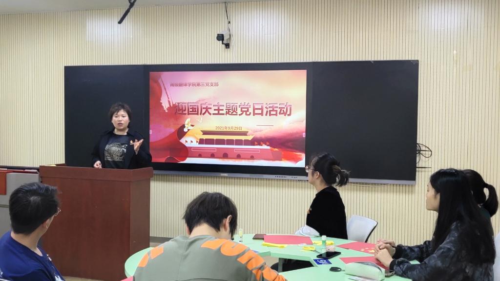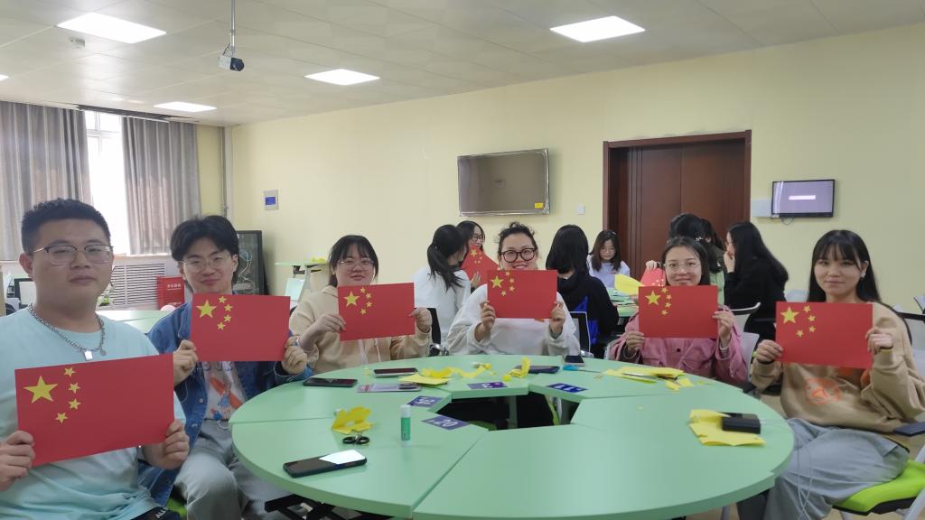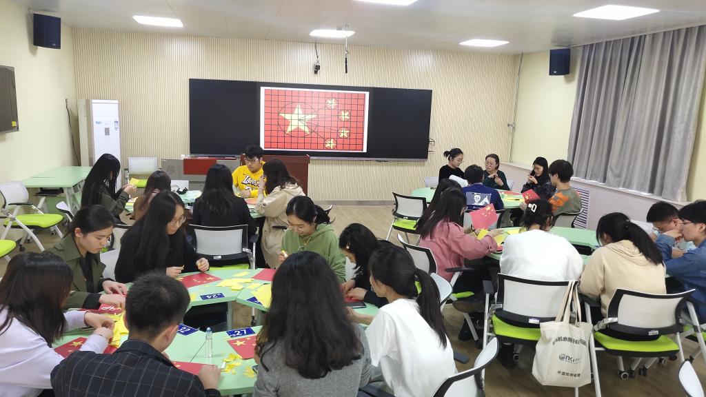 此次党日活动中,通过预备党员李松润讲党课《我国第一面五星红旗》,生动形象的为我们分别讲述了中国国旗的由来、设计及其象征意义,让每位党员更深入的了解我国国旗的发展及其重要意义,并了解了《国旗法》的内容。接着,在活动第二项观看影片《红岩》节选中“江姐绣红旗”的片段,本环节由学生党员朱珂星带领大家观看,她给大家讲述了这面特殊的五星红旗背后的真实故事。革命志士把对中国共产党、对新中国坚贞的爱“绣”进了红旗中,电影的原型就是小说的主人公罗广斌,如今,这面特殊的五星红旗收藏于国家博物馆。随后在,学生党员手工制作国旗环节中,由学生党员韩星语、庄冰冰首先给大家讲解制作国旗的标准,四颗小星星和大星星的位置摆放要求,并指导大家现场制作国旗。最后,第三党支部全体党员一同为祖国母亲72岁华诞献上了诚挚的祝福:“祝祖国母亲生日快乐,请党放心,强国有我!”