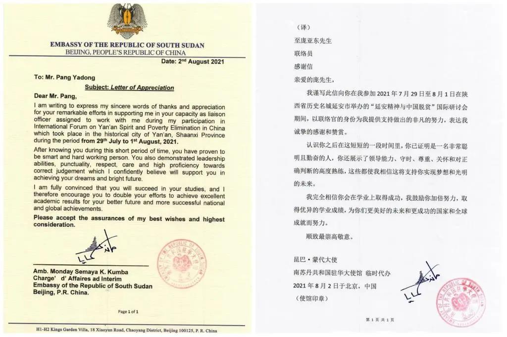 在这封感谢信中,南苏丹大使昆巴·蒙代对庞亚东同学在“延安精神与中国脱贫”国际研讨会期间,以联络官的身份为他提供支持而做出的非凡努力表示诚挚的感谢和赞赏。他认为在这短短的一段时间里,我校学生庞亚东已证明自己是一名非常聪明且勤奋的人,同时还展示了自己的领导能力。庞亚东的守时,所展现出来的尊重、关怀和对正确判断的高度熟练,都使南苏丹大使相信这将支持庞亚东实现自己的梦想并拥有光明的未来。信件最后,南苏丹大使鼓励庞亚东加倍努力取得优异的学业成绩,更好地为自己的未来,为国家的未来而努力。