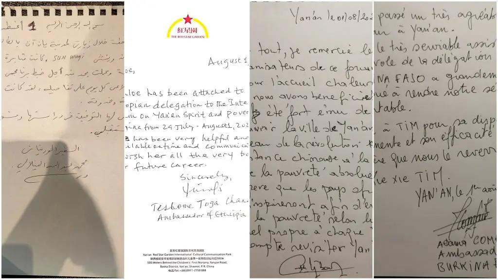 | ▲非盟驻华大使,喀麦隆参赞,非盟驻华大使夫人(从左至右)为我校学生手写感谢信 |