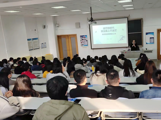 张芳以“迷茫的时代 就业路上不迷茫”为主题,首先分析了我校毕业生近几年的就业情况,并具体结合KY开元集团近几年来毕业生升学就业情况,对即将就业的大学生提出三点建议:一是要正确认识社会,二是要正确认识自己,三是要做好心理准备。