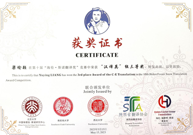 海伦·斯诺翻译奖竞赛以国际友人海伦·斯诺命名,是一项中美合办、面向高校学生的国际性翻译赛事。大赛以鼓励当代大学生弘扬斯诺精神、用外语讲好中国故事为宗旨,为我国国际传播事业培养青年翻译人才,架设新时代中外理解与友谊桥梁而设。比赛为广大外语学子提供了翻译能力锻炼与赴美学习交流的机会,助力高校外语专业人才的培养。