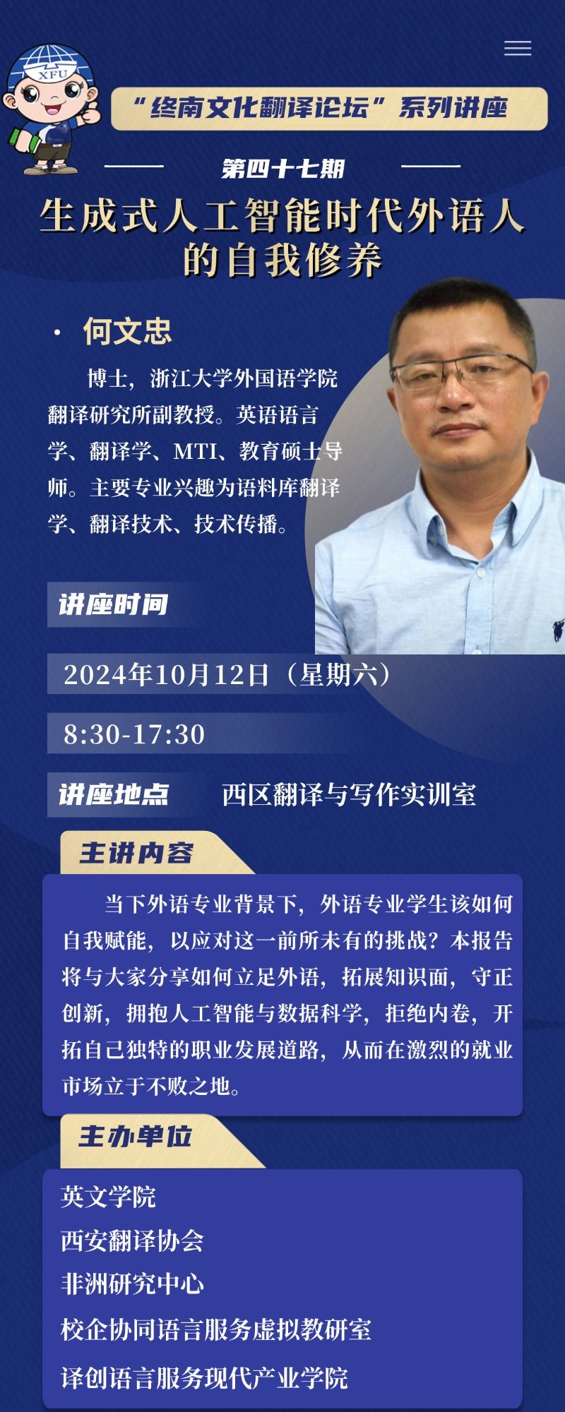 主题:“终南文化翻译论坛”系列讲座第四十七期——生成式人工智能时代外语人的自我修养