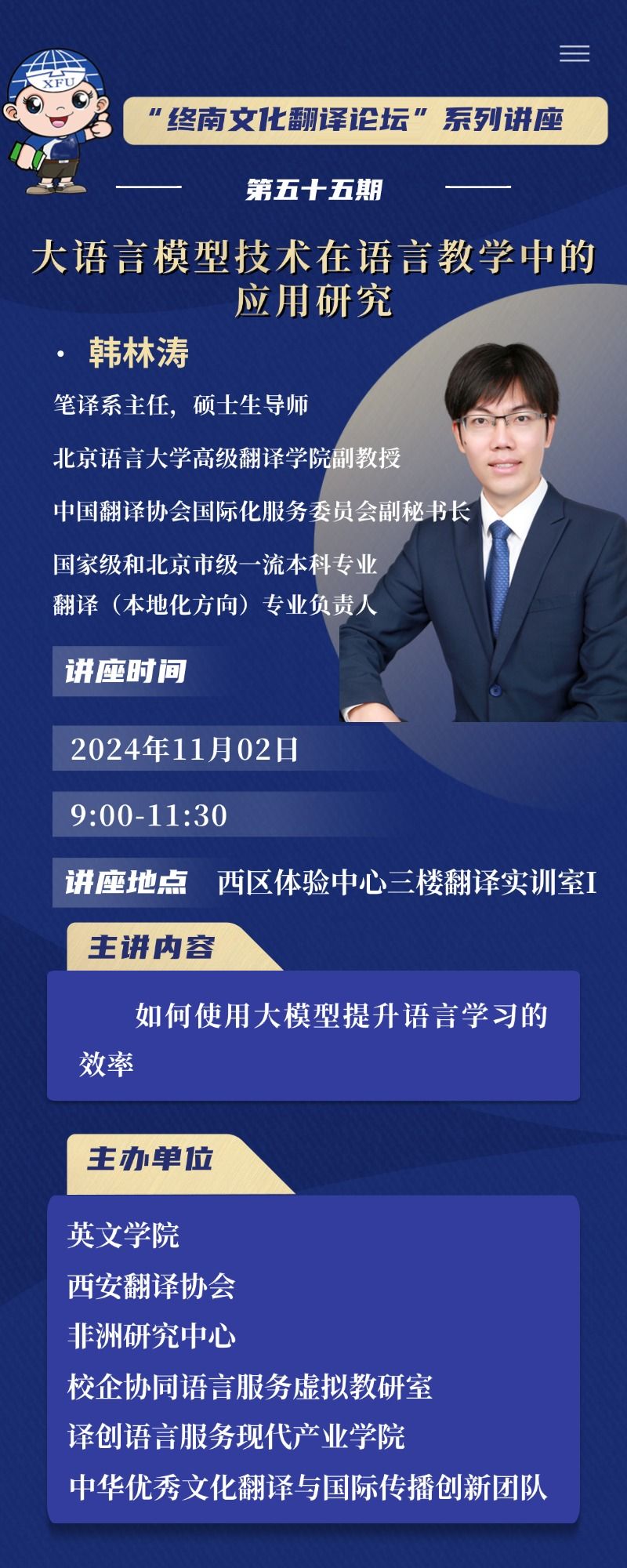 主题:“终南文化翻译讲坛”系列讲座第五十五期——大语言模型技术在语言教学中的应用研究
