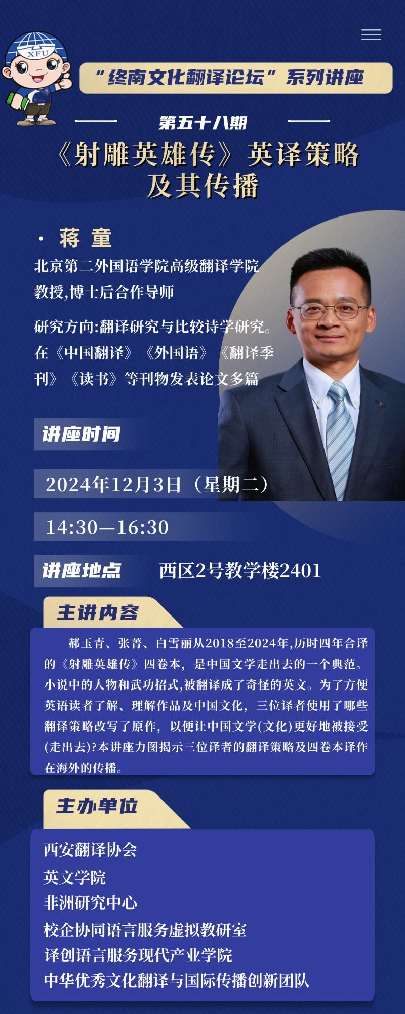 主题:“终南文化翻译讲坛”系列讲座第五十八期——《射雕英雄传》英译策略及其传播