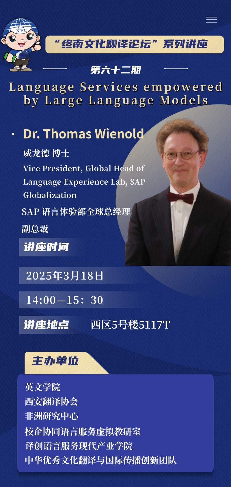 主题:“终南文化翻译讲坛”系列讲座第六十二期——Language Services empowered by Large Language Models