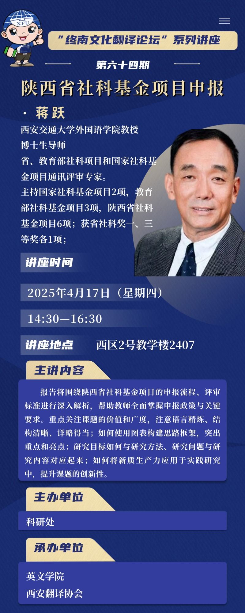 主题:“终南文化翻译讲坛”系列讲座第六十四期——陕西省社科基金项目申报