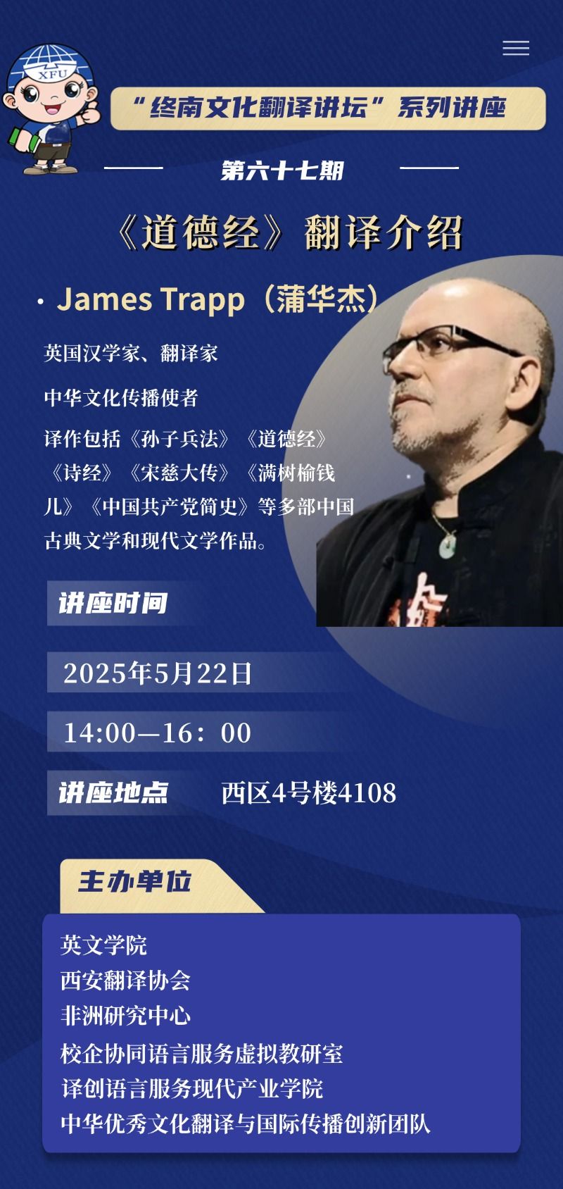 主题:“终南文化翻译讲坛”系列讲座第六十七期——《道德经》翻译介绍