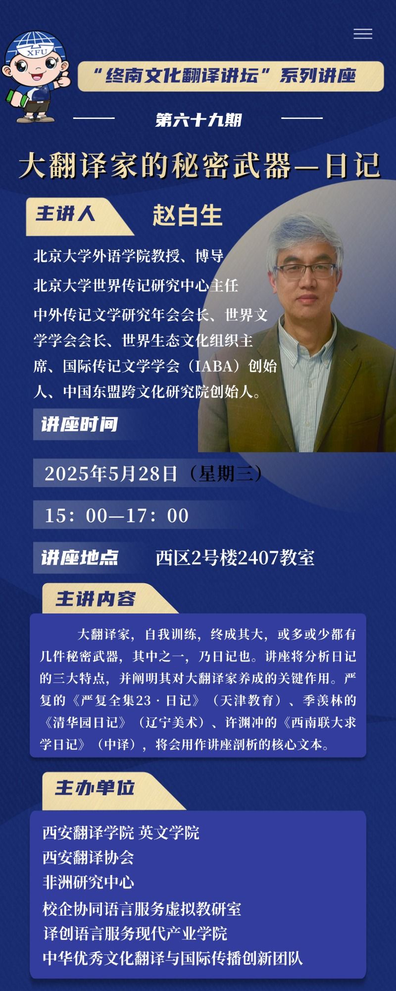 主题:“终南文化翻译讲坛”系列讲座第六十九期——大翻译家的秘密武器——日记