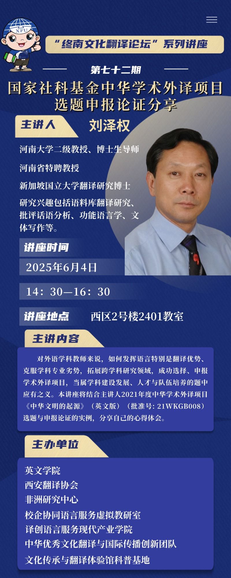 讲座主题:“终南文化翻译讲坛”系列讲座第七十三期——国家社科基金中华学术外译项目选题申报论证分享