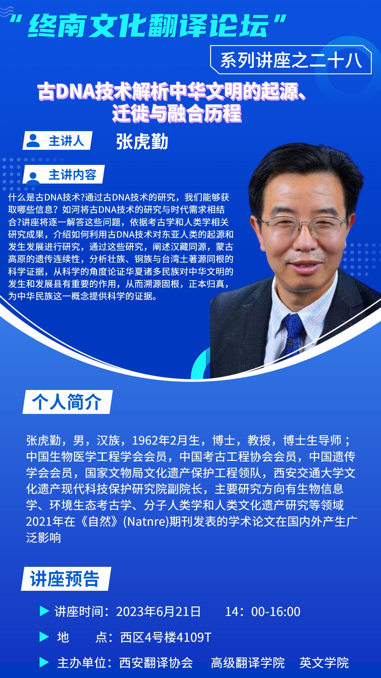 讲座主题:终南文化翻译系列论坛系列讲座--古DNA技术解析中华文明的起源、迁徙与融合历程