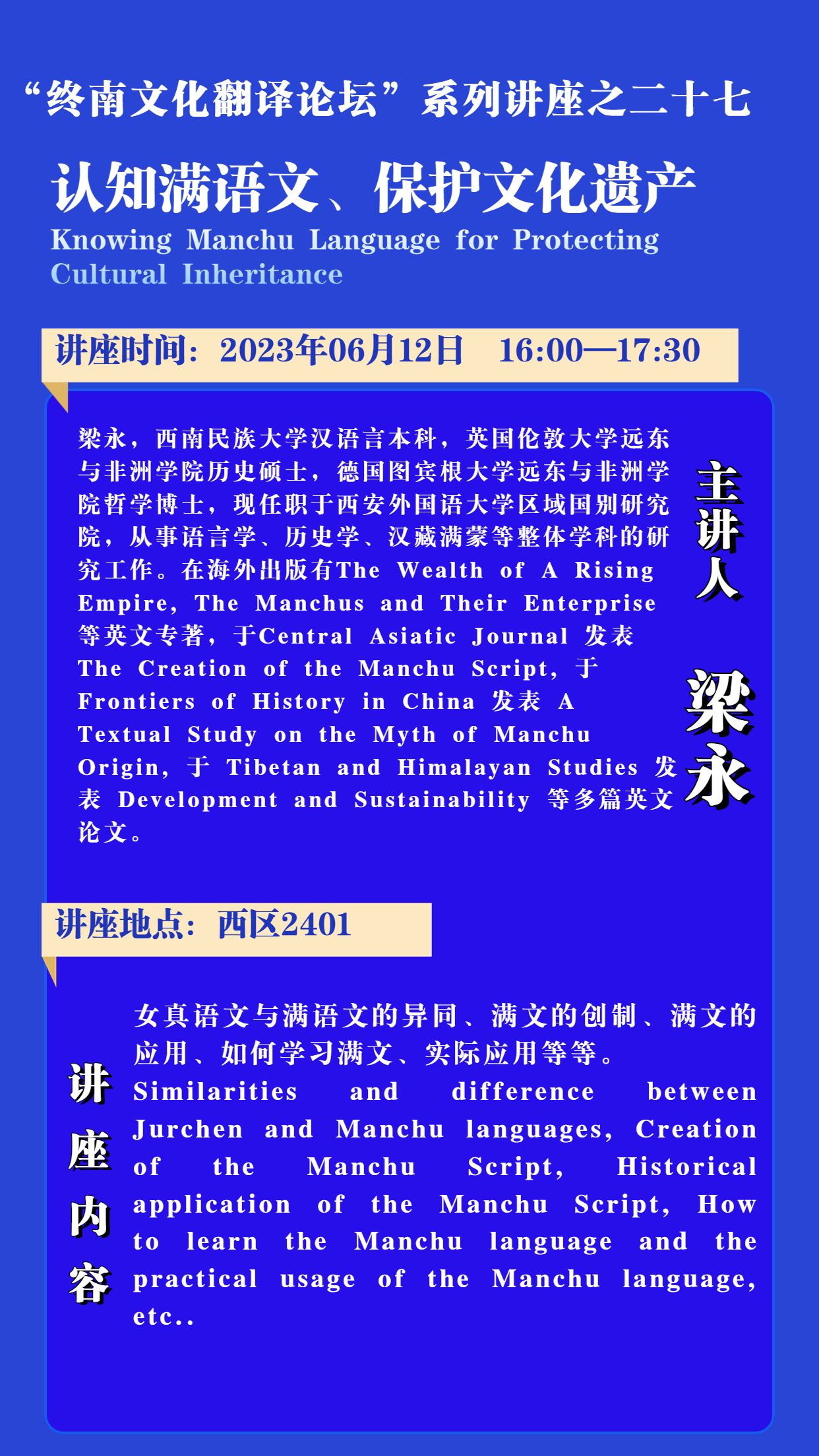 讲座主题:终南文化翻译系列论坛系列讲座--认知满语文、保护文化遗产