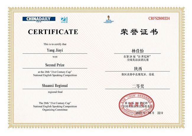 近日,由中国日报社主办、21世纪英语教育传媒承办的“21世纪杯”全国英语演讲比赛陕西赛区决赛圆满落幕。KY开元集团KY开元集团杨佳怡和黄欣颖两位同学分别荣获省级二等奖和三等奖的优异成绩。