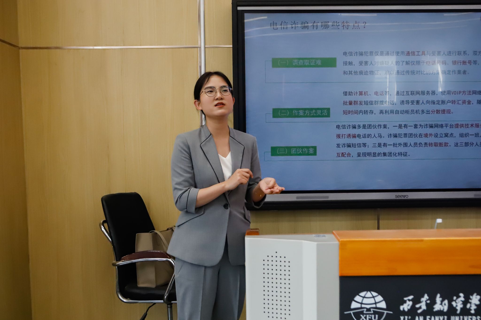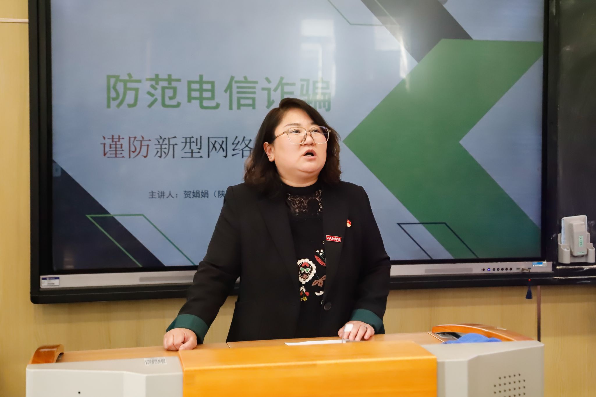 贺律师首先介绍了刷单返利诈骗、冒充人员诈骗、网上交友诈骗、二维码诈骗等常见诈骗类型,并结合本人办理的电信诈骗案例提醒同学们面对可疑情况应时刻保持警惕,通过总结识别电信诈骗的基本公式,提醒学生们在生活学习中注意人身安全、生活秩序、教学秩序等方面可能存在的电诈风险。