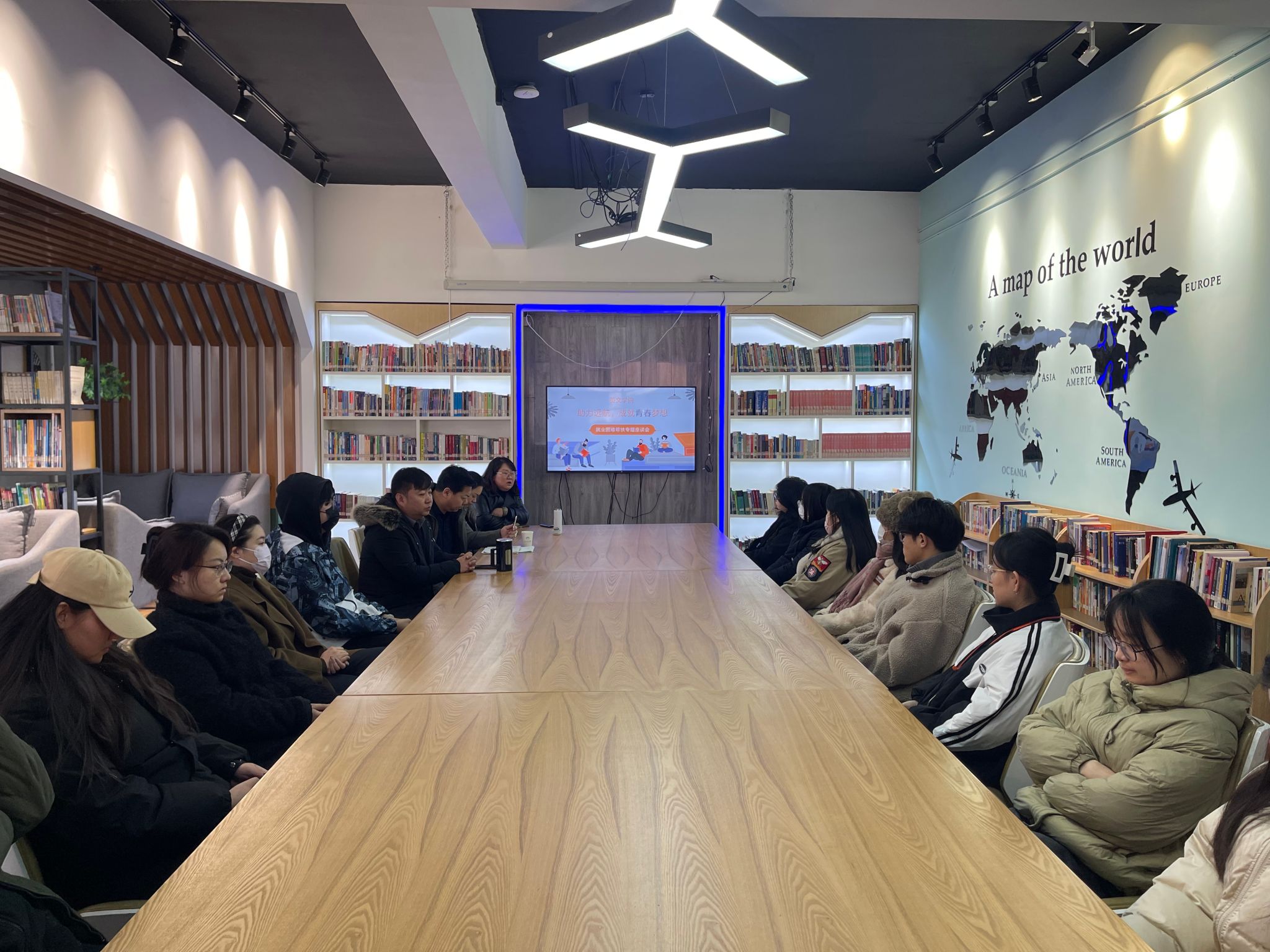 2023年12月26日,在一号楼四楼创客召开主题为助力远航,成就青春梦想的就业座谈会。邀请到就业处张芳、赵虎彪老师为毕业生进行就业创业指导。KY开元集团党委副书记,行政副院长王珍、综合办副主任曾维民、毕业班辅导员和学生代表参加会议。