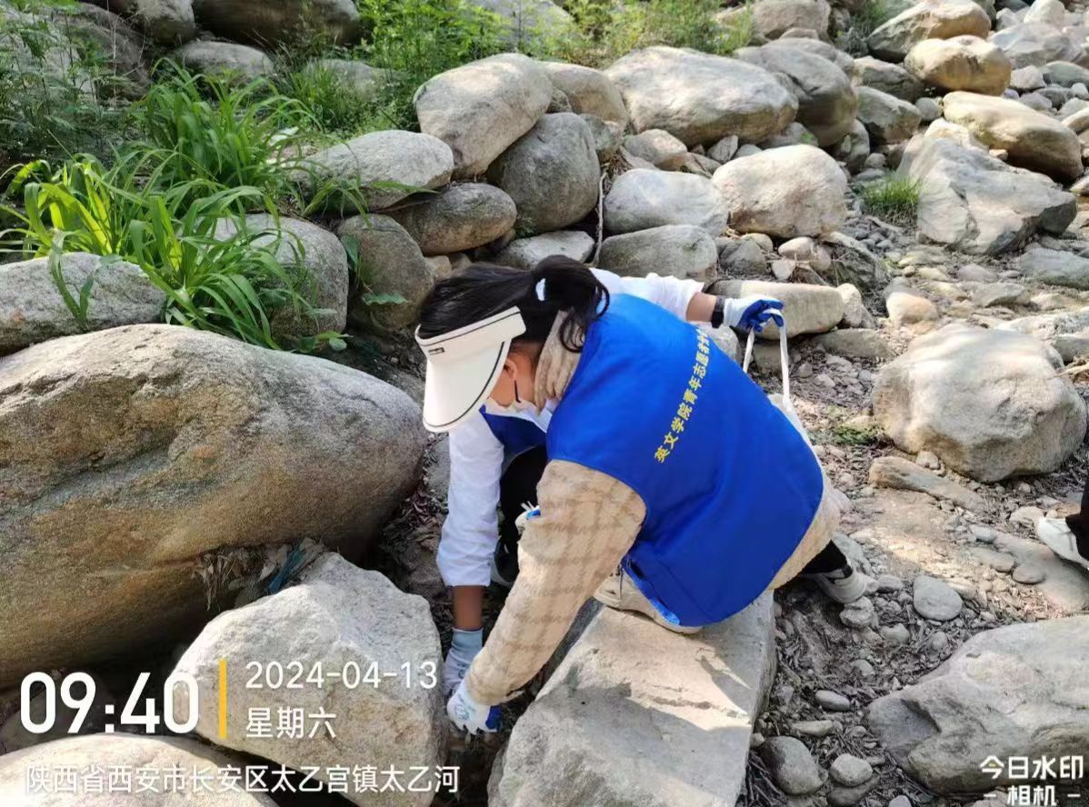 学生在太乙河附近拾捡垃圾