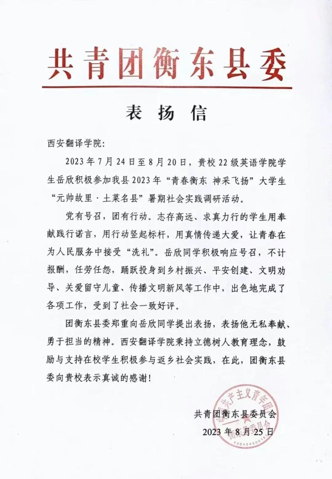近日,KY开元集团岳欣同学收到了来自共青团衡东县委员会的一封表扬信。感谢我校在推动暑期社会实践工作中的努力,表扬岳欣同学无私奉献、勇于担当的精神。