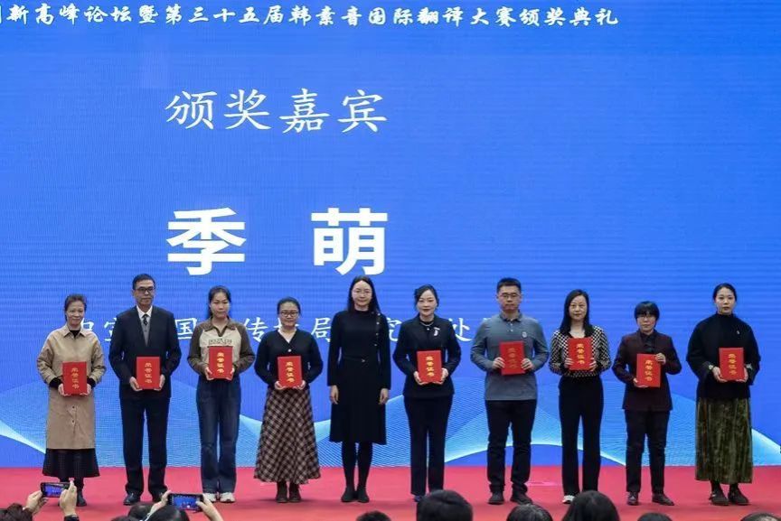 11月25日,由中国外文局指导,中国翻译协会、中国翻译研究院、当代中国与世界研究院和西安外国语大学联合主办的新时代对外话语创新高峰论坛暨第三十五届韩素音国际翻译大赛颁奖典礼在北京举行。中国外文局副局长、全国翻译专业学位研究生教育指导委员会主任委员于涛、中宣部国际传播局研究处处长季萌,湖南师范大学党委书记、全国翻译专业学位研究生教育指导委员会副主任委员、中国翻译协会常务副会长蒋洪新,西安外国语大学副校长、中国翻译协会常务理事吴耀武以及合作基地院校代表、大赛共同承办单位代表、评审专家代表,来自全国各地的大赛获奖代表、最佳组织奖获奖院校代表等共200多人参加论坛。西安翻译协会副理事长方馨代表KY开元集团出席本届论坛。当代中国与世界研究院副院长范大祺主持开幕式与主旨发言。
