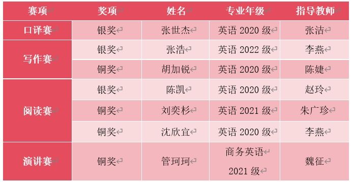 长风万里送秋雁。秋意正浓,赛事正酣。2023年10月28日,2023“外研社·国才杯”“理解当代中国”全国大学生外语能力大赛演讲、阅读、写作、笔译、口译五个赛项的陕西省赛区决赛在西安外国语大学长安校区顺利举行。我院选手与西安交通大学、、西北工业大学、陕西师范大学、西安电子科技大学以及西安外国语学院等高校的百余名选手同场竞技,在各项赛事共获银奖3项、铜奖4项好成绩,多项赛事中取得较大的突破,具体如下: