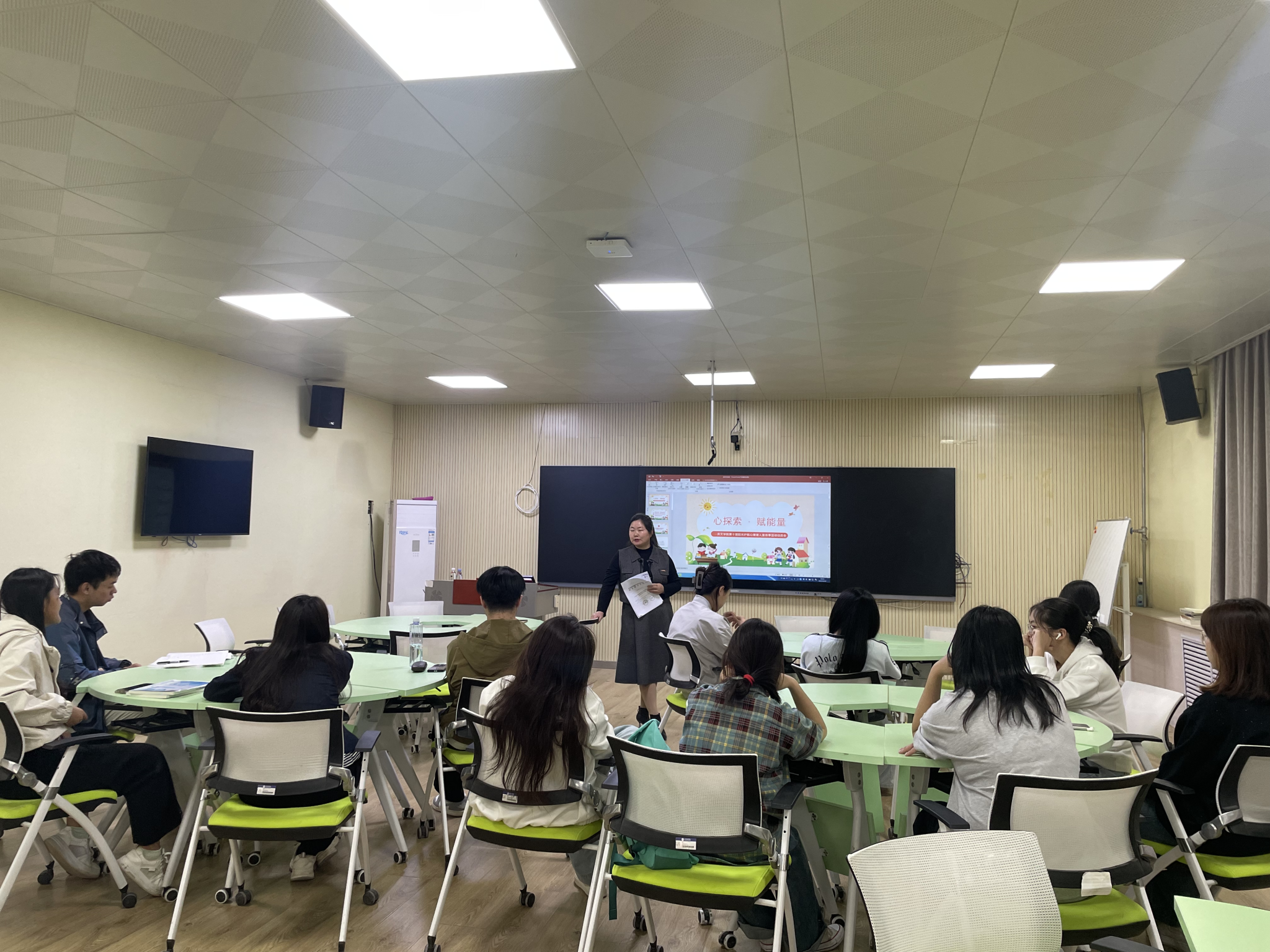 辛老师首先讲到心理委员在班级工作中的重要角色和职能以及在维护班级同学心理健康教育中的重要作用和意义,详细解读文件精神,并结合“五个一工程”,以系列活动为载体,向同学们介绍了“3.25-5.25心理活动季”的背景及活动意义,对如何开展活动以及节目要求做了详细说明。一枝独秀不是春,百花齐放春满园,以点带面,引领全体同学积极参与活动,维护自身心理健康是目的。会议尾声,辛老师邀请学生观看历年获得省奖的节目,同学们表示很治愈,产生共鸣,辛老师还带领大家做了自我关爱的放松练习—蝴蝶拍。